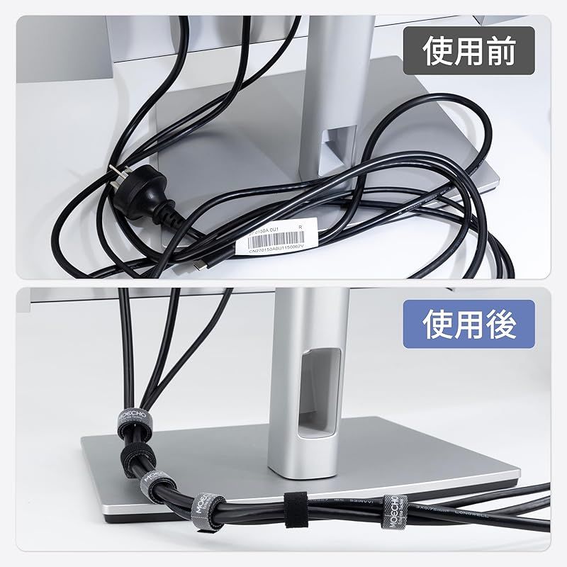 【自由に調整・ケーブルが傷みにくい】ケーブルバンドは、柔らかい素材を採用し、ミシン目加工付き、必要に応じた長さを手でちぎれます。ケーブルなどにもピッタリ巻き付き、コードやケーブルなどが傷みにくいです