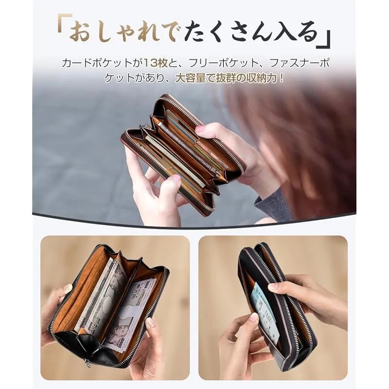 【高級素材・シンプルなデザイン】 余計な装飾はせず、「シンプルで使いやすい」をこだわりました。手の中に納まるサイズながら小銭入れのマチを広めにとって小銭を出しやすくしたり、カードの出し入れもスムーズに行えるように設計しています。ベーシックな小銭入れつきの長財布で、カード入れは13枚分つき。 背面にもポケットつきでレシートやチケットなどの収納までも、いつでも綺麗に整理できます。