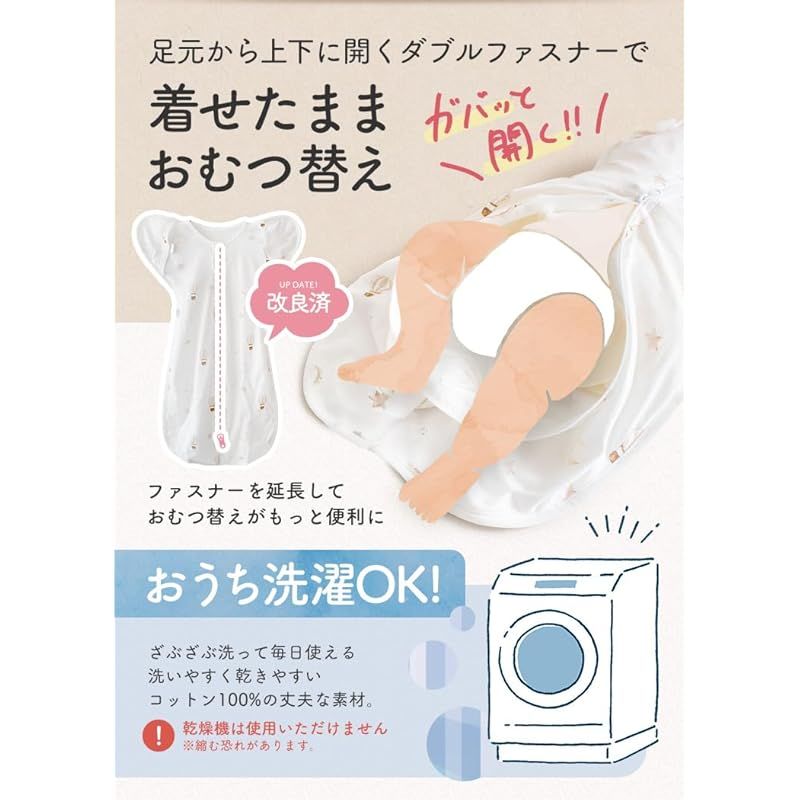 【ゆったり足回り+Wチャック採用】脚まわりはゆったり、さらにWチャックを採用しているのでスワドルをつけたまま、おむつ替えが出来ます♪また、上部チャック部分はカバー付きで、チャックによるケガを防ぎます。 手足も隠れて、全身を覆うので、お家の中でのお昼寝、パジャマ、旅行、お出掛け等様々なシーンで使えます。春秋冬の防寒はもちろん、夏場の冷房対策にもできます。オールシーズン対応!春、夏、秋、冬1年間通してご使用いただけます。
