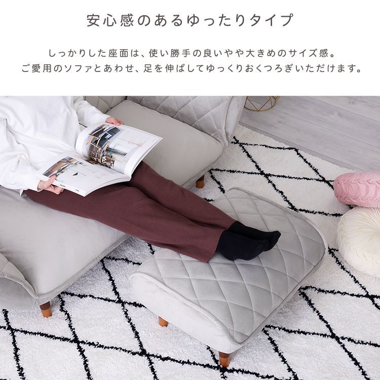 【商品説明】 ダイヤモンドキルトのオットマン単品! 座面のダイヤモンドキルトがおしゃれで高級感のある雰囲気を演出します。 少し大きめの作りでオットマンだけでなくテーブルやスツールとしてもお使いいただけます。
