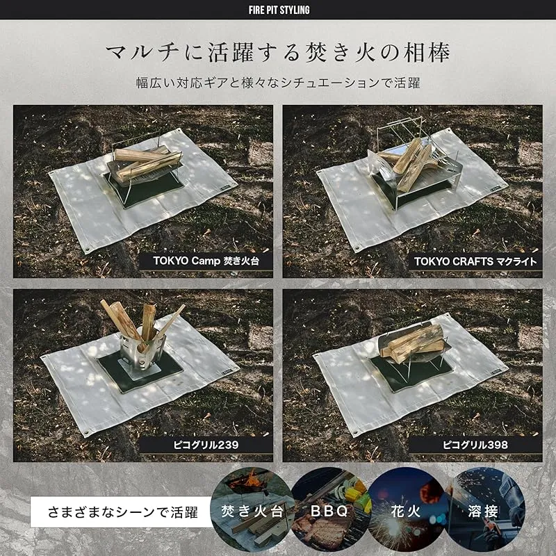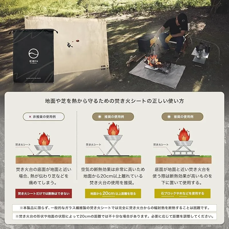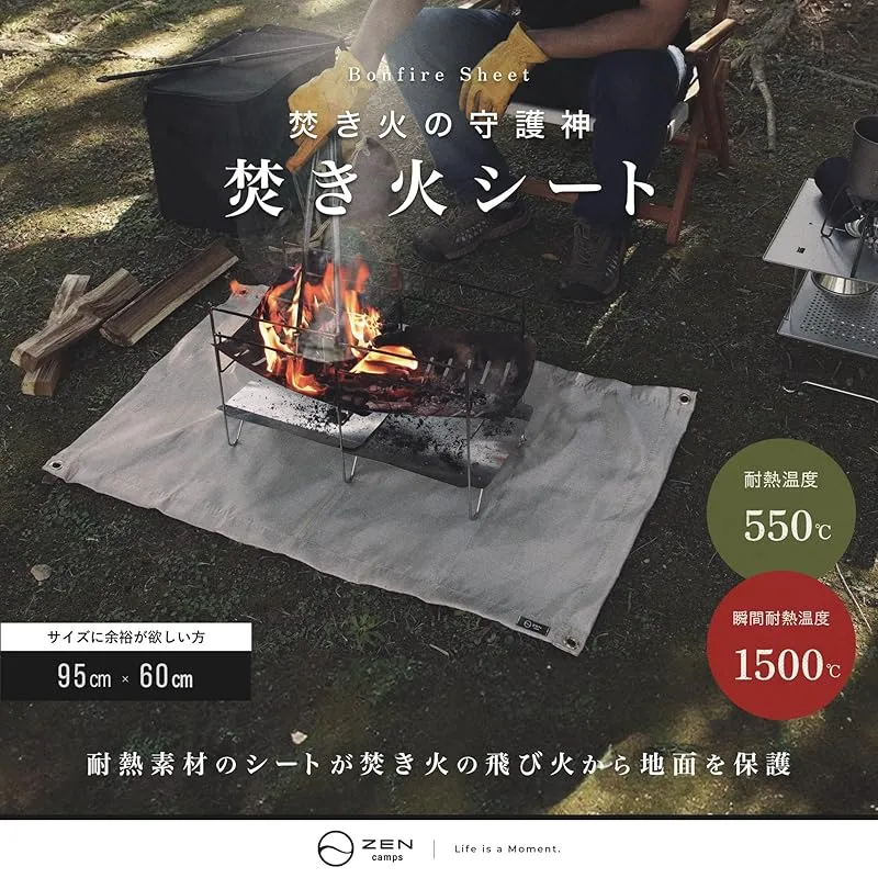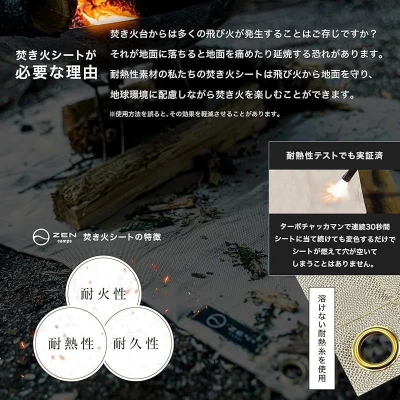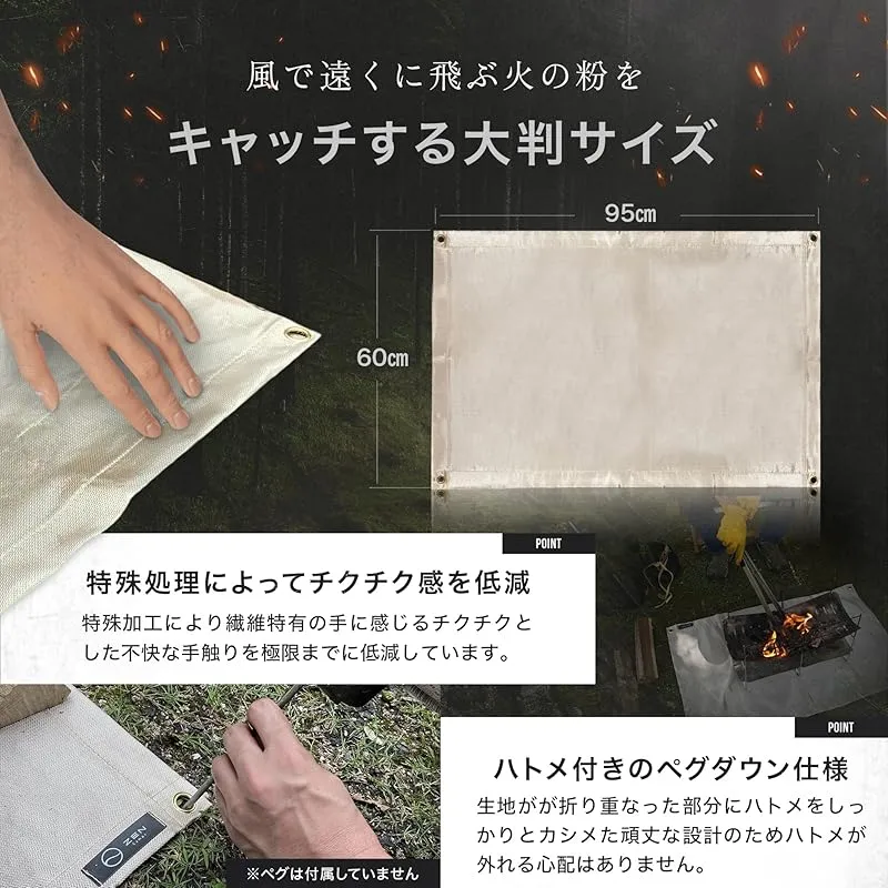 【商品概要】 焚き火やBBQによる飛び火で地面を傷めないのはキャンプの基本マナー。焚き火台やグリル台からの飛び火等による地面の植物や地中の微生物への被害を最小限にするために是非焚き火専用シートをお使いください。 たき火時の専用シートとして開発され、耐熱温度約550℃で熱に強く、焚き火台から発生する放射熱を遮り火の粉や燃えかすがこぼれた時に地面や芝、ウッドデッキ等のダメージを軽減します。地面を焦がさず環境に配慮しながら焚き火をお楽しみください!・サイズ 使用時:約95cm×60cm 重量:約320g。 軽量で折りたためるので持ち運び時も便利です。ソロから2~3人のキャンプ向けアイテム。 素材:ガラス繊維。特殊加工によって、ガラス繊維特有の手に感じるチクチクとした痛みはなく、手触りが良いためガラス繊維が苦手な敏感肌のユーザーにおすすめです! 縫製に使用する糸も難燃性のものを使っているので糸の部分に火の粉が落ちても意図が切れることはありません。 ハトメつきなので、風が強い場合にもペグダウンできて安心。ハトメはシートが三重に折り重なっている部分にカシメられており強度が高いです。風が強い場合にもペグダウンできて安心。焚き火台だけでなく、2つに折って使用すれば卓上バーベキューグリルにも使用できます。キャンプ、バーベキュー、その他様々なシーンに使えるシートです。大活躍 、どこでも、たき火が楽しめる!火の粉から大地を守ります。 安心の日本ブランド。「品質」ご購入日から、1年間のが付いています。初期不良、欠陥品場合は早急に対応致しますので出品者連絡でお問合わせください。また、商品について何か質問や問題があれば、いつでも、遠慮なくご連絡ください。