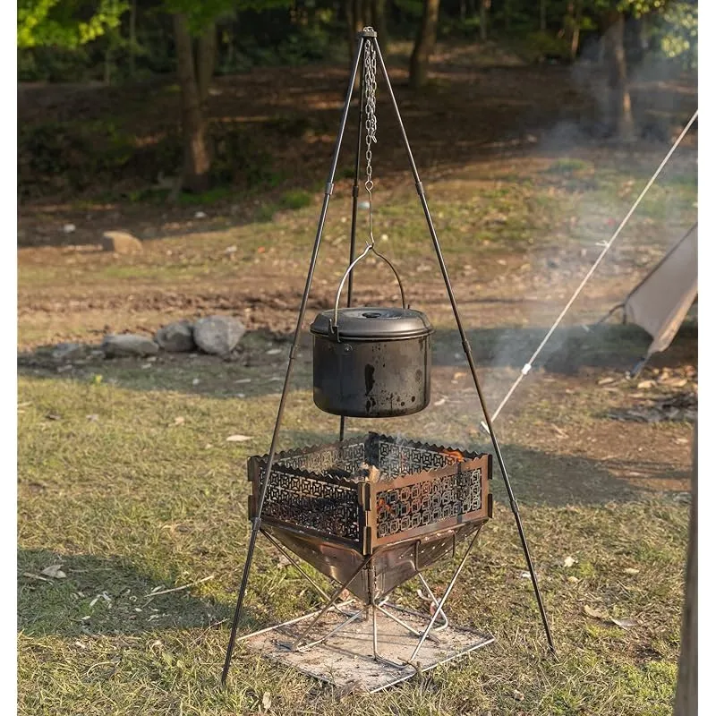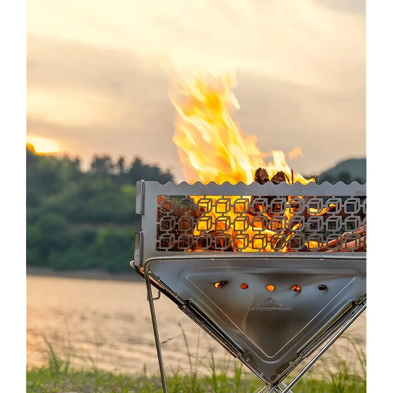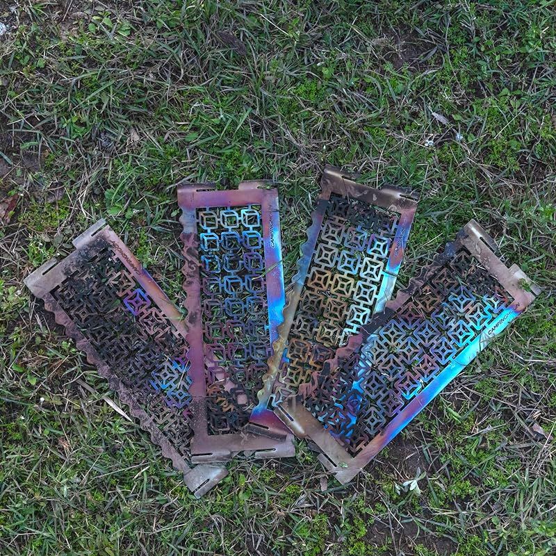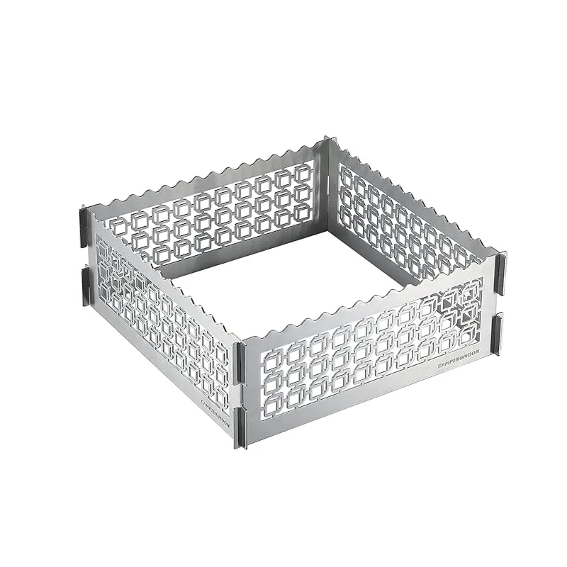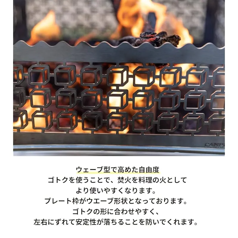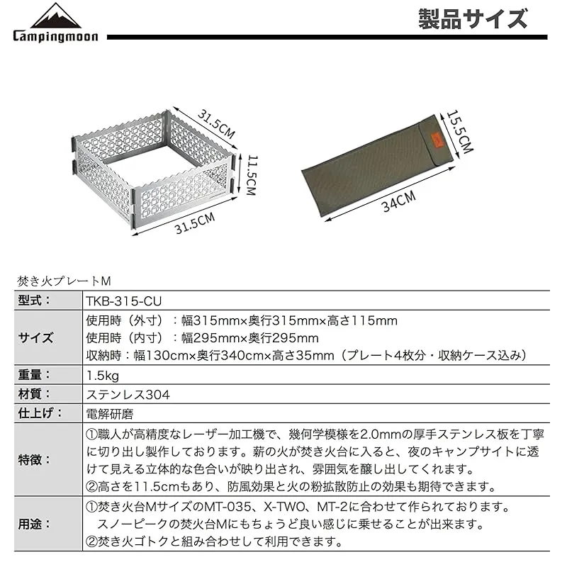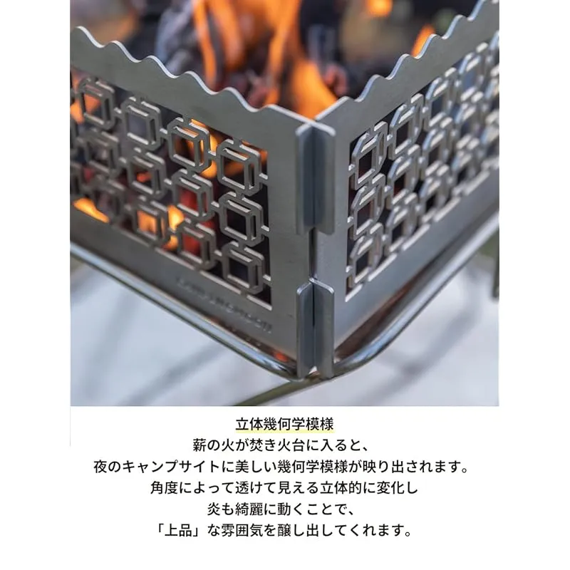 【商品概要】 材質:SUS304(板厚2.0mm) 総重量:1.5kg 使用時サイズ:外寸 / 315mm×315mm×H115mm 、内寸 / 295mm×295mm 職人が高精度なレーザー加工機で、幾何学模様を2.0mmの厚手ステンレス板を丁寧に切り出し製作しております。薪の火が焚き火台に入ると、夜のキャンプサイトに透けて見える立体的な色合いが映り出され、雰囲気を醸し出してくれます。 高さを11.5cmもあり、防風効果と火の粉拡散防止の効果も期待できます。 用途:焚き火台MサイズのMT-035、X-TWO、MT-2に合わせて作られております。 スノーピークの焚火台Mサイズにもちょうど良い感じに乗せることが出来ます。 焚き火ゴトクと組み合わせして利用しても良いです。