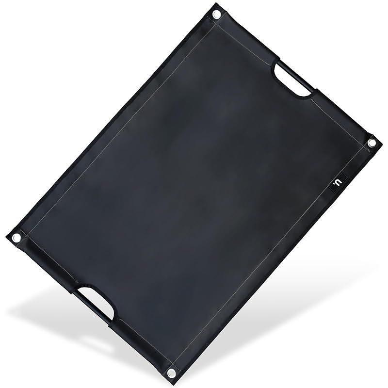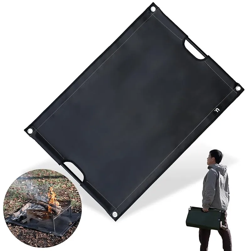 【商品仕様】重量:ガラス繊維に両面シリコンコーティングを施した高耐熱難燃性素材の焚き火シート。色は黒(ブラック)と緑(カーキ)の2色から選択可能です。重量,約550g。ハトメ付きシートにより、風が強い場合にもペグダウンで固定可能です。シートにある取っ手で重たい薪を載せたままで移動可能。キャンプ、バーベキューなど様々なシーンに使え、芝生や草の生えているキャンプサイト等でも火の粉から大地を守り焚き火が楽しめる多機能焚き火シートです。※本製品にペグは付属していません。