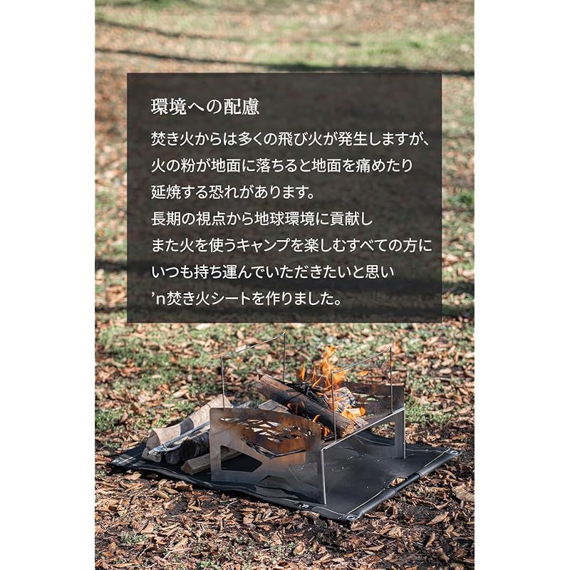 【注意事項】熱源を直接焚き火シートの上に置かないで下さい。ガラス繊維製の焚き火シートは飛び火による瞬間的な熱から地面を守り延焼を防ぎますが、焚き火台からの継続的な輻射熱は地面に伝わります。芝生などの保護のため火床と地面を離す(20cm以上が理想)、水に濡らした木など断熱性のある物をを焚き火台と焚き火シートの間に置く等してください。本焚き火シートは耐火・耐熱シートであり、断熱シートではありません。飛び火からの延焼を防ぐ道具とご理解ください。(意匠登録出願申請中。出願番号:意願2023-9622)