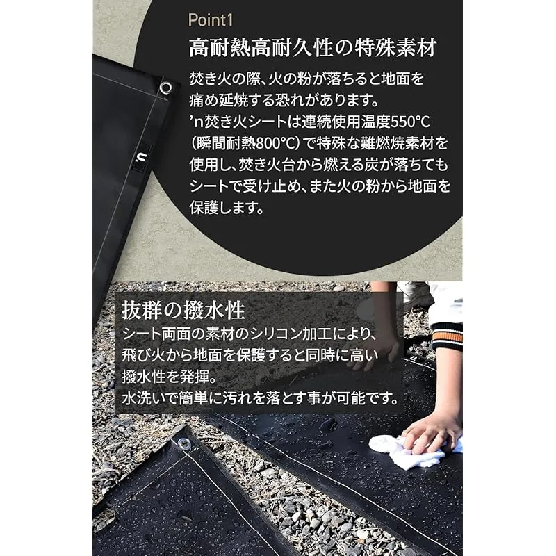 【高耐熱難燃素材】両面シリコンコーティング加工されたガラス繊維素材の高耐熱の焚き火シート。両面をシリコン加工している事によりグラスファイバー特有の不快感があるチクチクしない仕様となり、チクチク感への対策を万全にしています。良質のガラス繊維により、変形に強く、耐摩耗、腐食に強く、電気絶縁性能も持っており、高耐熱高耐久の難燃シートです。また撥水性もあるので地面が濡れた場所でも使用可能で水で洗える仕様です。縫製用の糸なども難燃性素材を採用しており高熱対策も万全です。耐熱温度550℃優れた焚き火シートです。