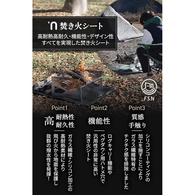 【機能性の追求】当製品の'n焚き火シートはガラス繊維に両面シリコンコーティングを施した高耐熱難燃性素材を採用したのみではなく、取っ手を加え薪バッグの機能を持たせました。焚き火シートに加え薪バッグの様に持ち運びを実現しています。薪を焚き火シートの上に置いたまま持ち運びや移動をしやすくしており、バーバーベキュー・焚き火の前後に薪の持ち運びを容易にしました。またペグを刺す様のハトメに付属の紐を接続することで肩掛けカバンの様にして、重量が重くなる多くの薪も楽に持ち運び可能になりました。