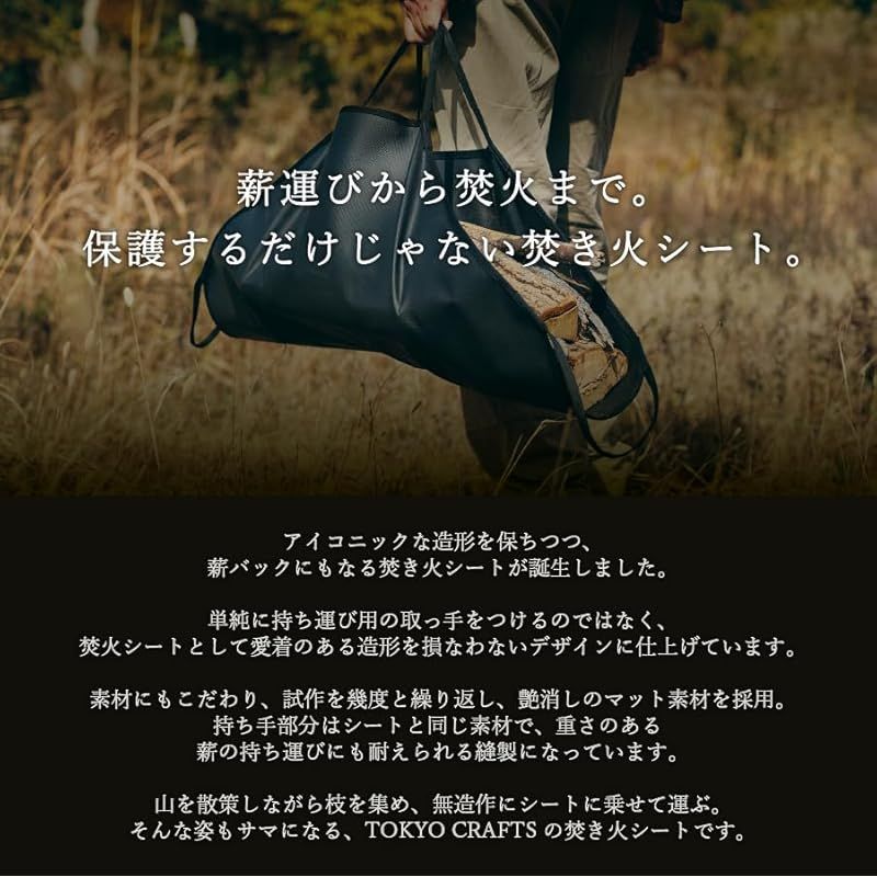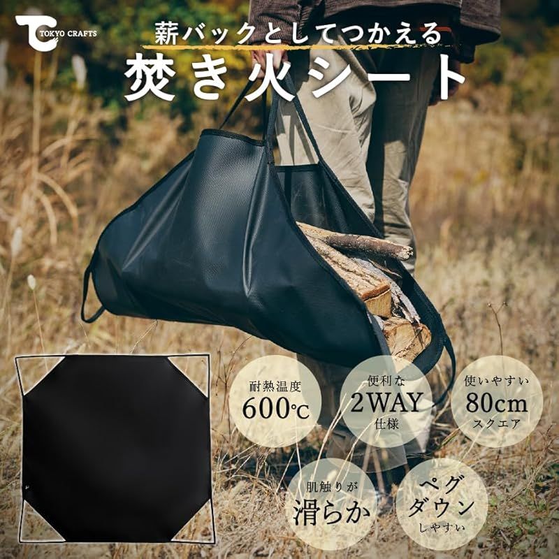 【薪運び・焚き火・灰処理をスムーズに】 TOKYO CRAFTSの焚き火シートは、耐熱600度のガラス繊維素材を使用し、焚き火やバーベキューで発生する火の粉や灰から地面をしっかりと保護します。ただ地面を保護するだけでなく、薪バッグとして薪を持ち運び、灰の後片付けもさっと行える便利な多機能なデザインです。シリコンコーティングにより汚れが付きにくく、お手入れも非常に簡単です。※注意事項をよく読みご購入ください