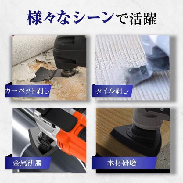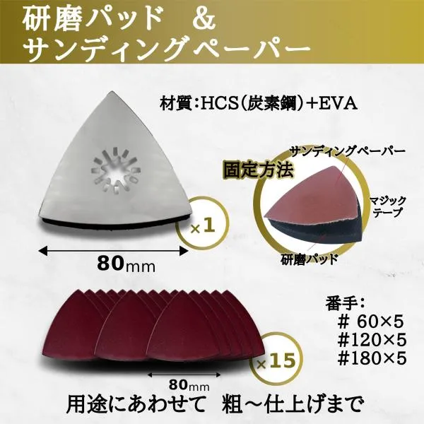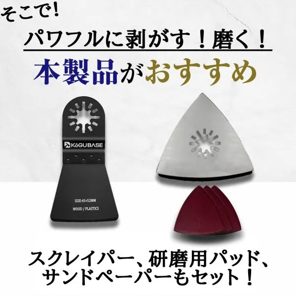 【製品特徴】 ・OIS規格対応!国内外のほとんどのマルチツールでご使用いただけます。 マキタ、 ハイコーキ(hikoki)、ボッシュ(bosch)の先端工具と互換性があります。 ※リノベーター マルチツールには取り付け出来ません ・炭素鋼スクレイパー、研磨パッド、サンディングペーパーのセットです。 ・研磨パッドとサンディングペーパーは、マジックテープで簡単に脱着できます ・安心の個包装、さらに今ならにハードケースに入れてお届けいたします。