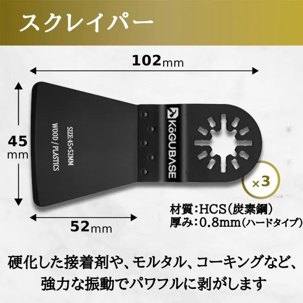 【商品内容・仕様】 ・スクレーパー(HCS高炭素鋼)×3枚 サイズ:全長102mm 刃幅45mm 刃長52mm 厚み0.8mm(硬;ハードタイプ) 重さ:約26.3g 用途:接着剤、モルタル、コーキング、フロア材、クロス、カーペットなどの剥離 ・研磨パッド(バネ鋼+EVA)×1枚 サイズ:直径80mm 重さ:約41.7g ・OIS規格専用(スターロックではご使用できません) ・サンディングペーパー×15枚(#60×5枚、#120×5枚、#180×5枚) 用途:粗研磨、仕上げ研磨など
