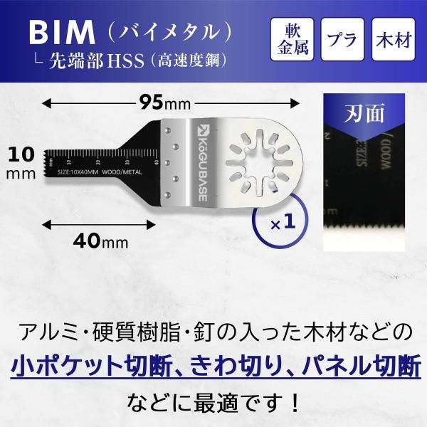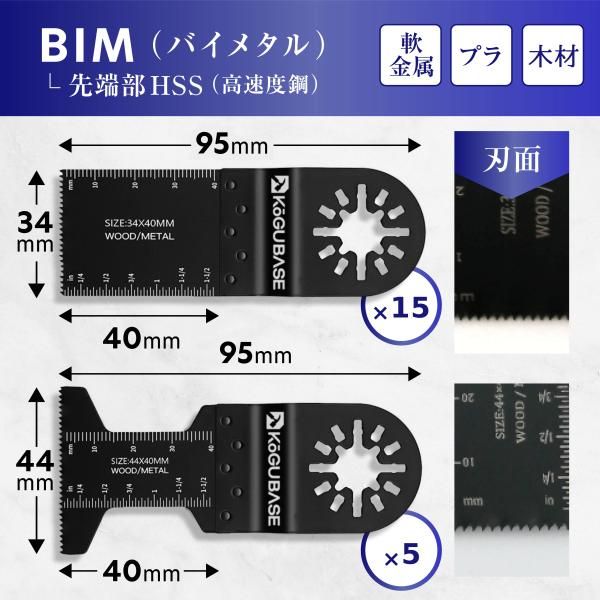 【内容】 ・バイメタル( BIM;高速度鋼(HSS)刃 ) 先端幅10mm × 1枚 先端幅34mm × 15枚 先端幅44mm × 5枚 用途:軟金属・細釘・アルミ材・木材・プラスチック等