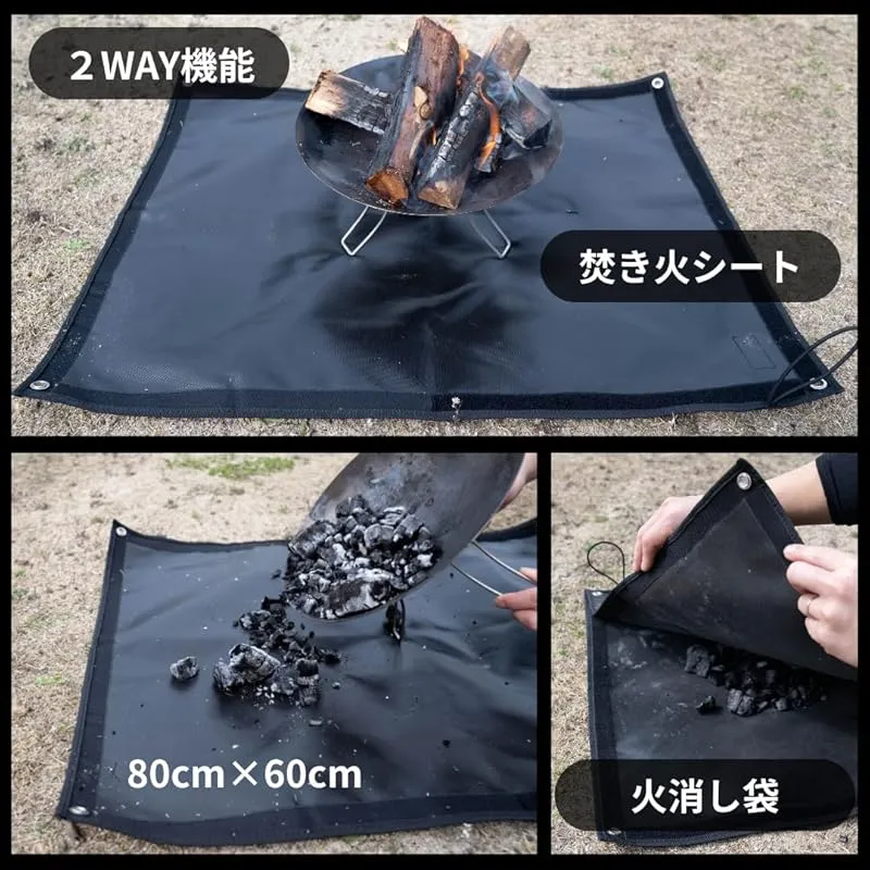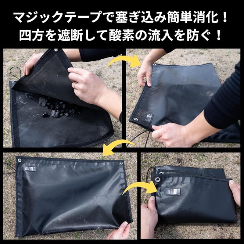 【スパッタシート兼、火消し袋】 グラスファイバー繊維でシリコンコーティングされており耐熱性・難燃性の生地で作られており、スパッタシートとして活用した後に、外周のマジックテープで塞ぐ混むことで、シート内の炭や燃えカスを酸欠状態にして鎮火することができます。