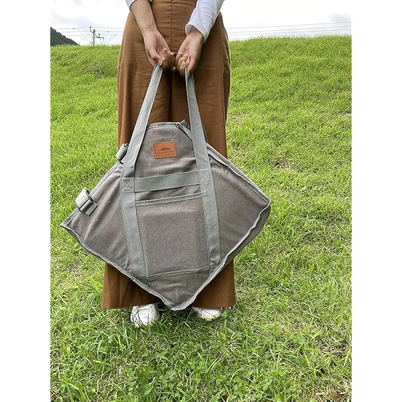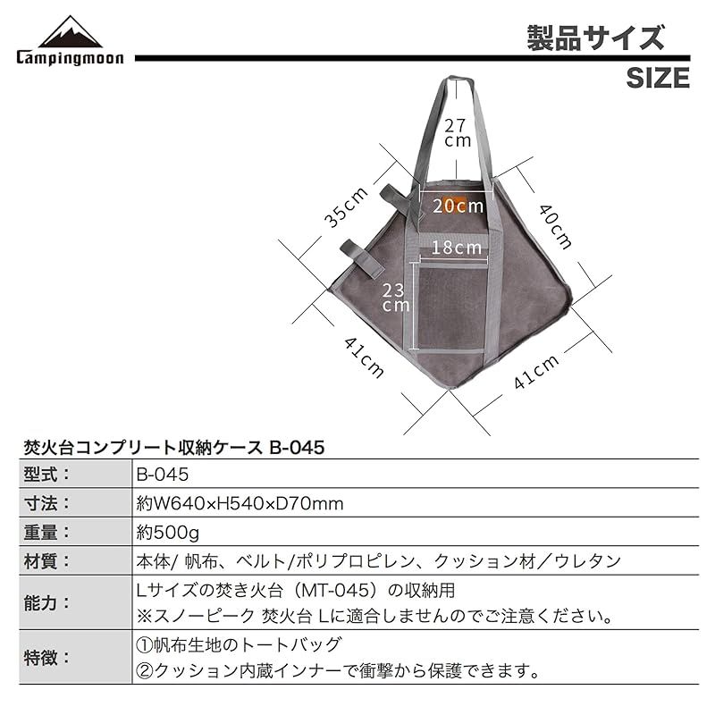 【商品概要】 サイズ:約W640×H540×D70mm 重量:(約)0.5Kg 本体/ 帆布、ベルト/ポリプロピレン、クッション材/ウレタン 用途:Lサイズの焚き火台(MT-045)の収納用 特徴:においが少ない素材を使用。ボンディング加工を施して軽さと耐久性が向上。