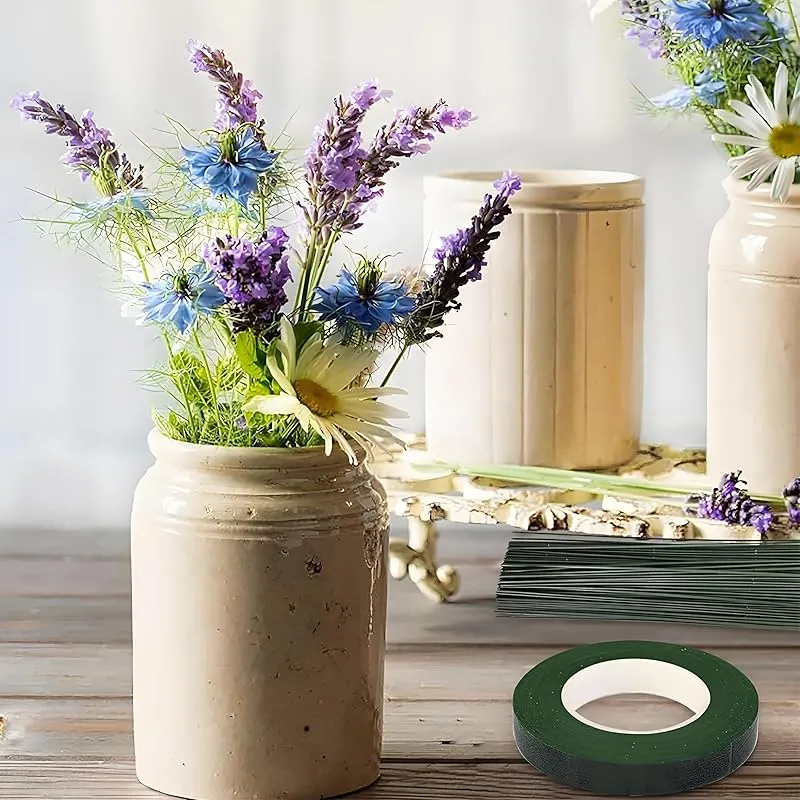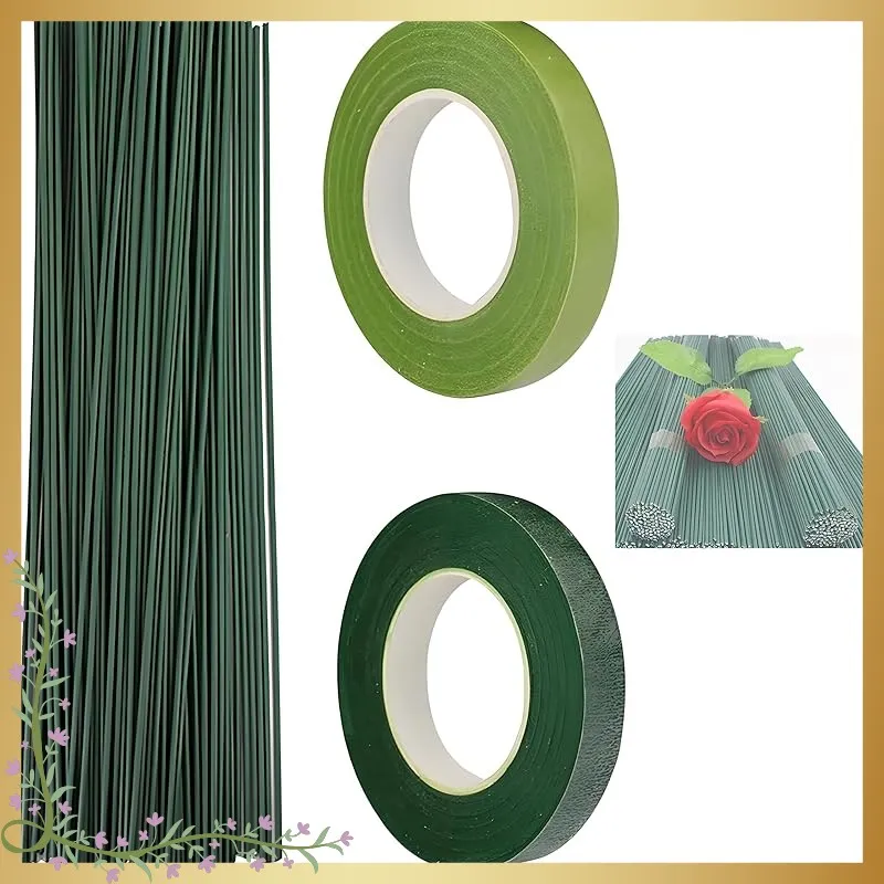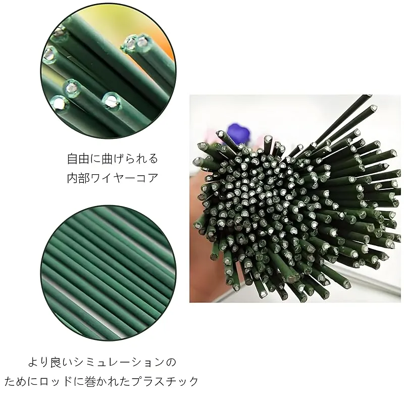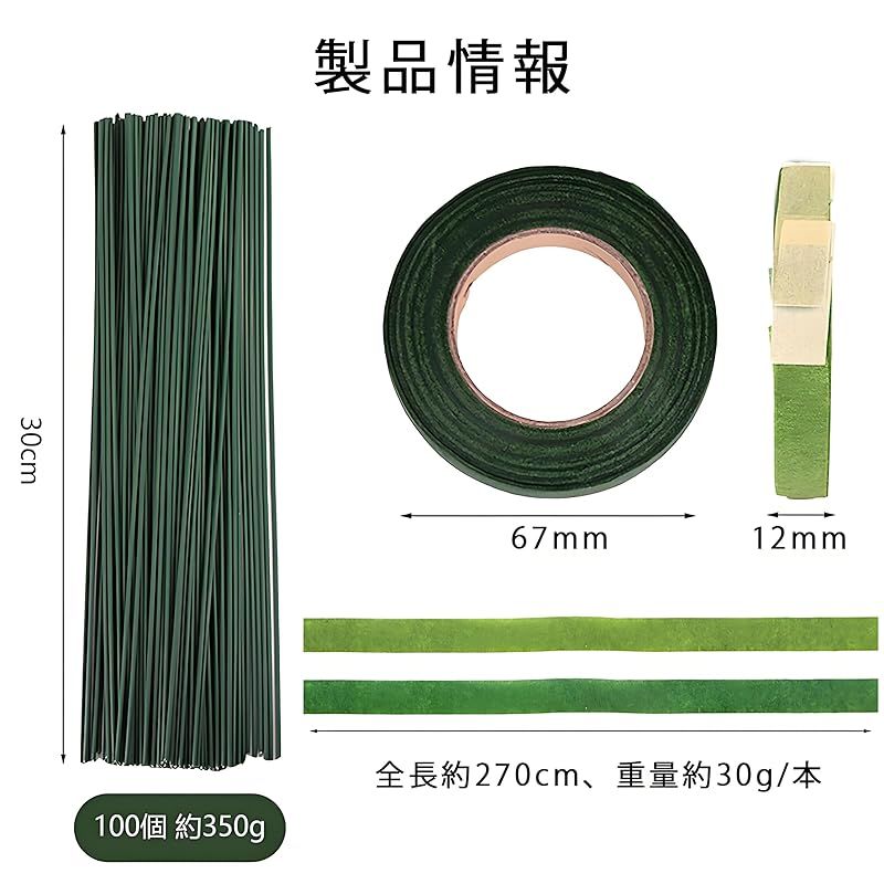【パッケージ内容】パッケージには、ダークグリーンのワイヤーフラワーロッド100本とフローラルテープ2巻が入っています。テープの色はダークグリーンとフルーツグリーンがあり 2.