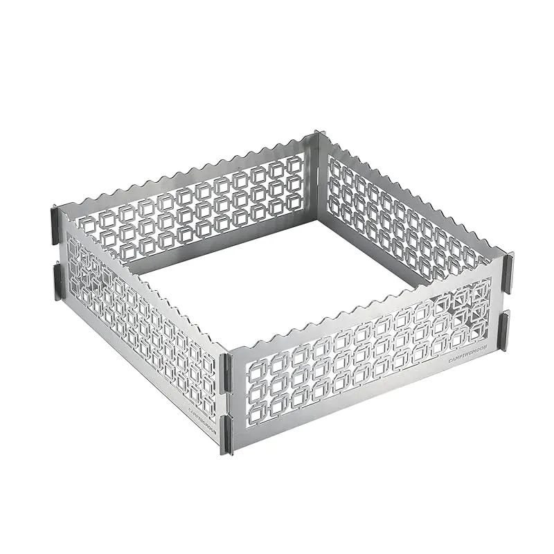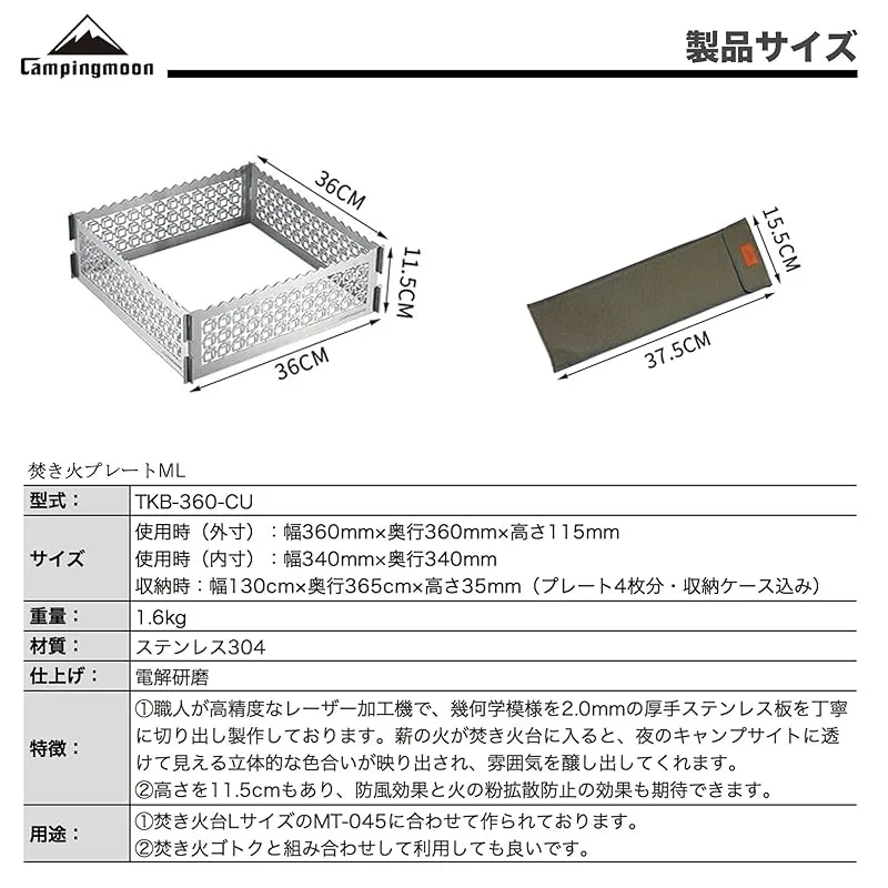 【商品概要】 材質:SUS304(板厚2.0mm) 総重量:1.6kg 使用時サイズ:外寸 / 幅360mm×奥行360mm×高さ115mm、内寸 / 幅340mm×奥行340mm 特徴:職人が高精度なレーザー加工機で、幾何学模様を2.0mmの厚手ステンレス板を丁寧に切り出し製作しております。薪の火が焚き火台に入ると、夜のキャンプサイトに透けて見える立体的な色合いが映り出され、雰囲気を醸し出してくれます。 高さを11.5cmもあり、防風効果と火の粉拡散防止の効果も期待できます。 用途:焚き火台MT-045に合わせてご使用いただきます。