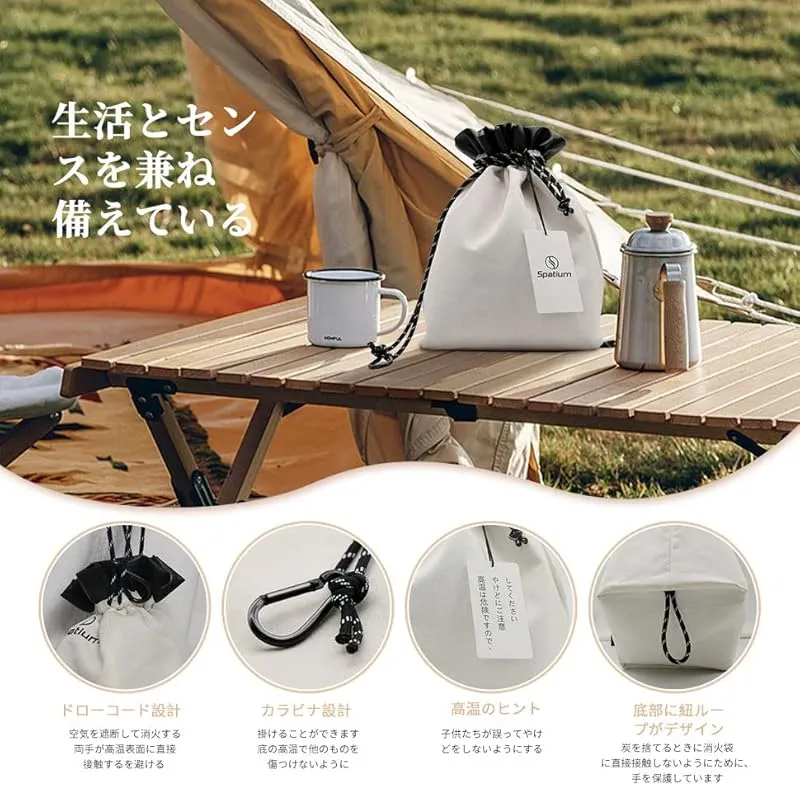 【よりユーザーフレンドリーなデザインロ】ープには登山ボタンの設計があり、ロープで袋の口を縛った後、簡単にぶら下げることができ、高温で荷物や道具を傷つけないようにするとともに、底部にはロープボタンが設計されており、炭を捨てるときに消火袋に直接接触しないようにして、保護している手 ?