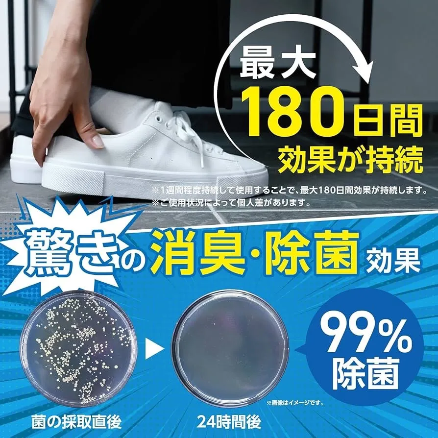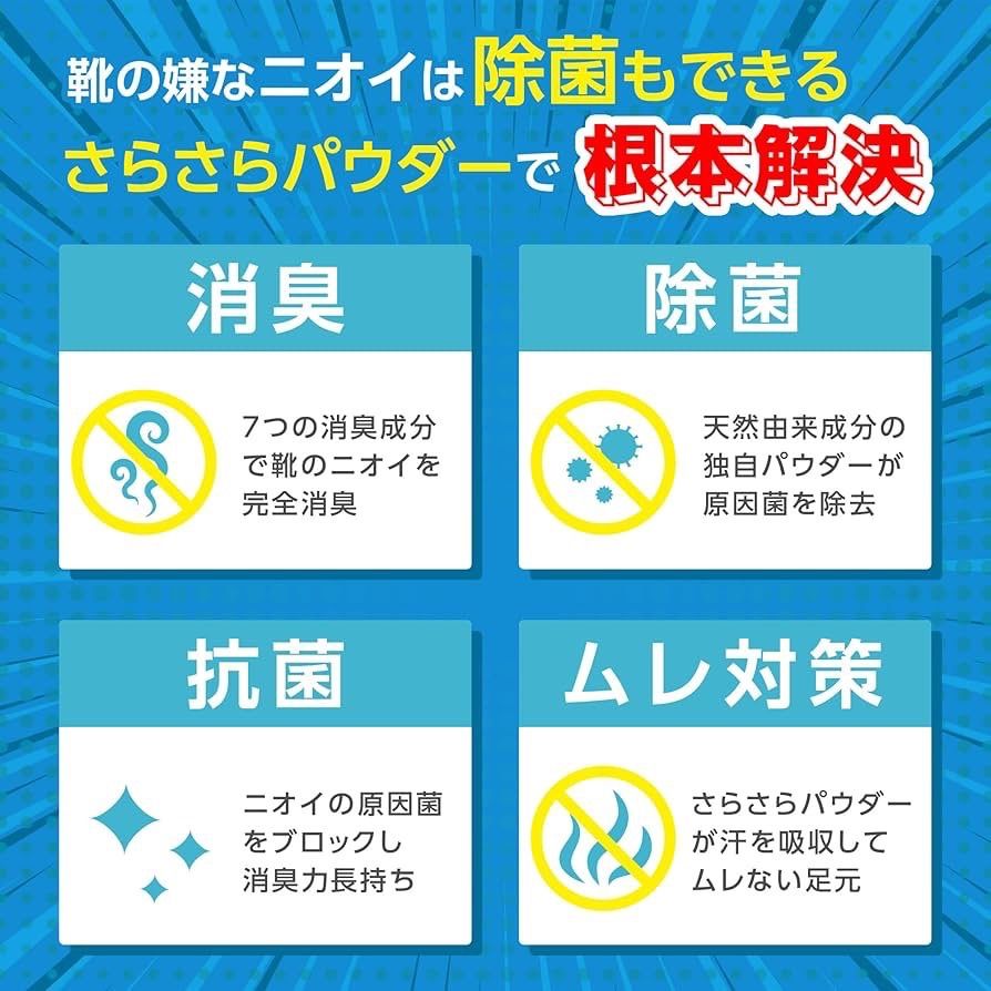 【7つの靴消臭成分】 足元を爽やかに保ちたいなら、この靴用消臭粉がおすすめです。超微粒子のシューパウダーが靴にしっかり馴染み、足の匂いや汗の対策もこれ一本で解決。足の匂い消しや靴の匂い消しをお探しの方にぴったりです。7つの天然由来除菌消臭成分が、靴の中の気になる匂いの元にアプローチし、長時間にわたって効果を持続。さらに、シューズパウダー 日本製ならではの高品質で、足元の潤いを守りながら、抗菌作用も発揮します。継続使用することで最大180日間効果が持続。忙しい毎日でも、快適な足元をサポートする頼れる靴の消臭粉です。