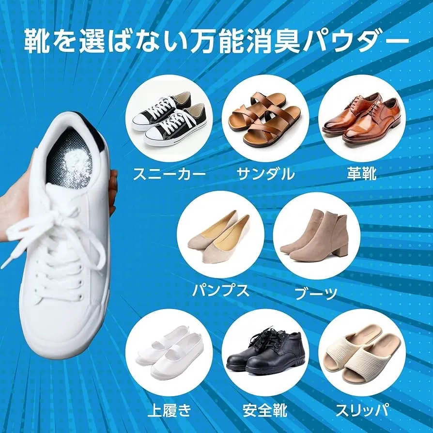 【安全・天然成分100%】 靴の匂いが気になる方に最適な足の匂い消し消臭粉は、天然由来成分を使用し、お子様から大人まで安心して使えます。また、デリケートな肌にも優しく、足元をしっかり保湿。靴の消臭や足の匂い消しに効果的で、スプレータイプではなく粉タイプなので、使いやすさも抜群。さらに、シューズパウダー 日本製の高品質な製造管理のもと作られており、家族全員で毎日お使いいただけます。