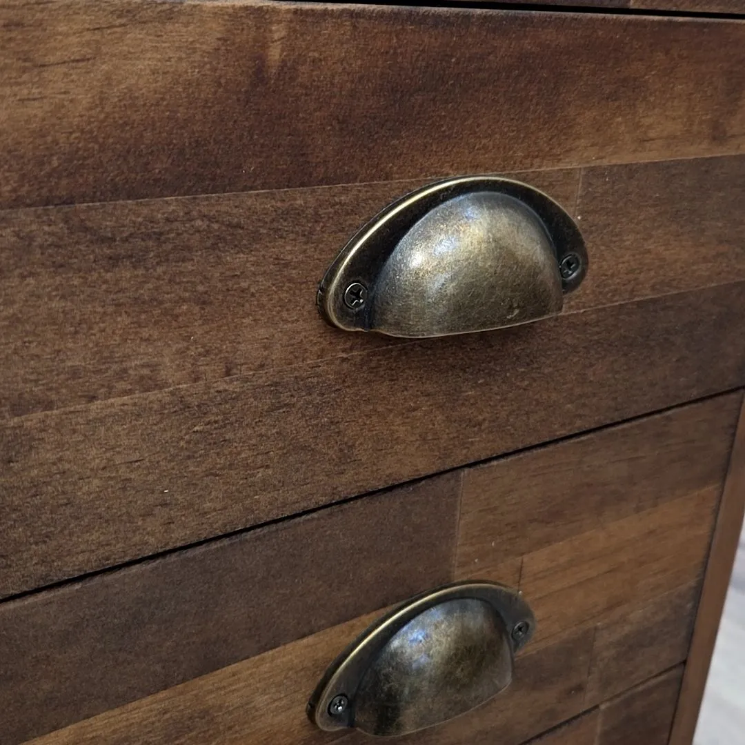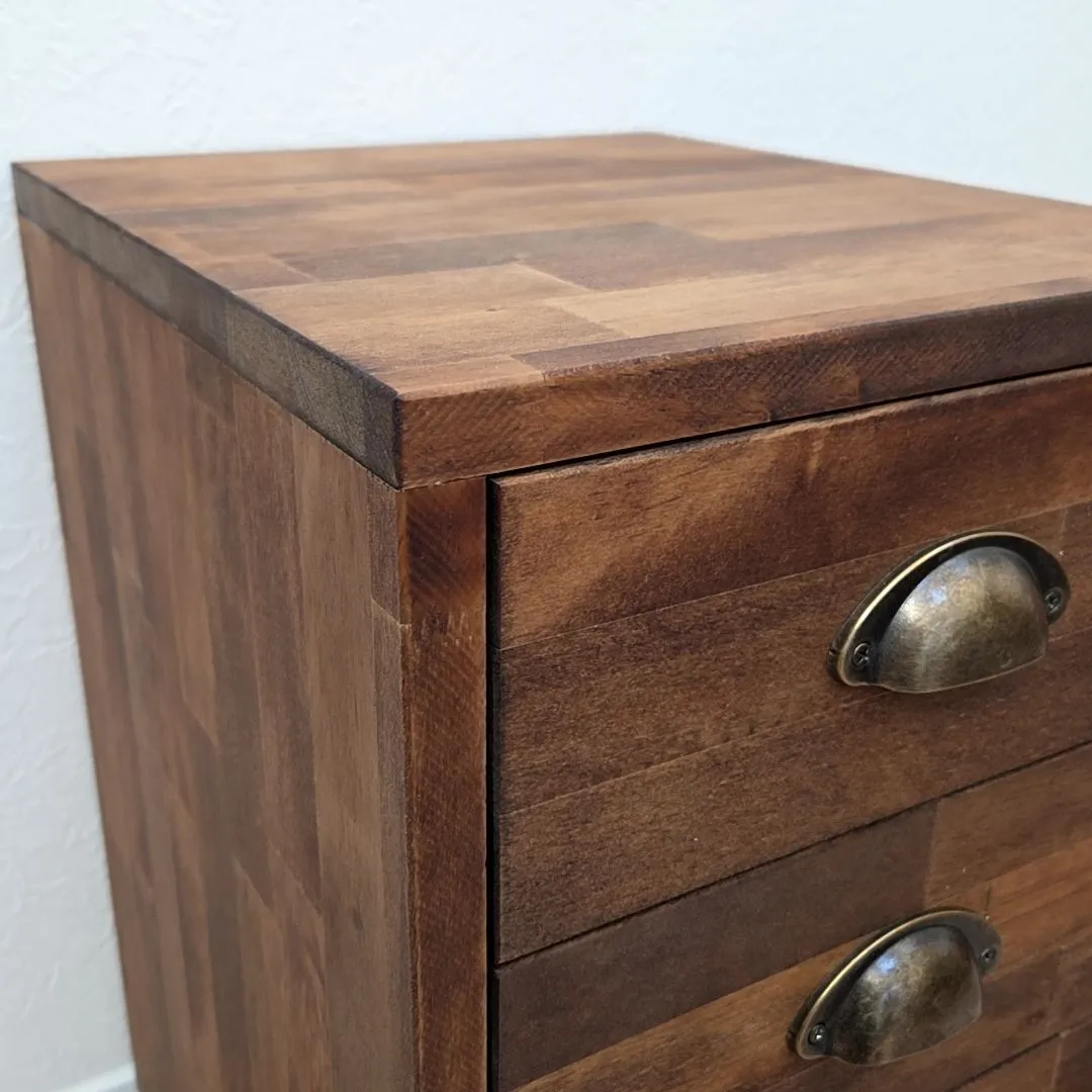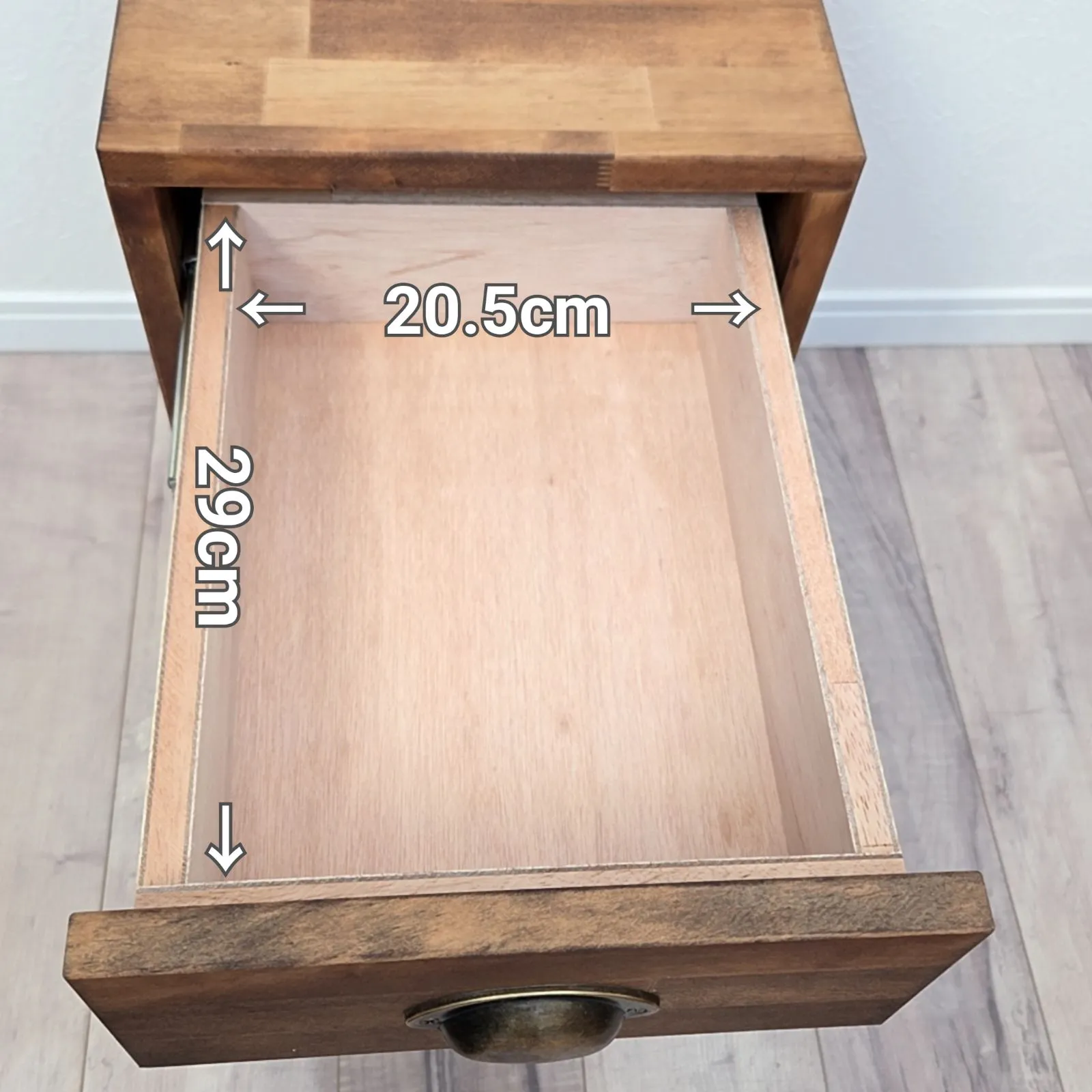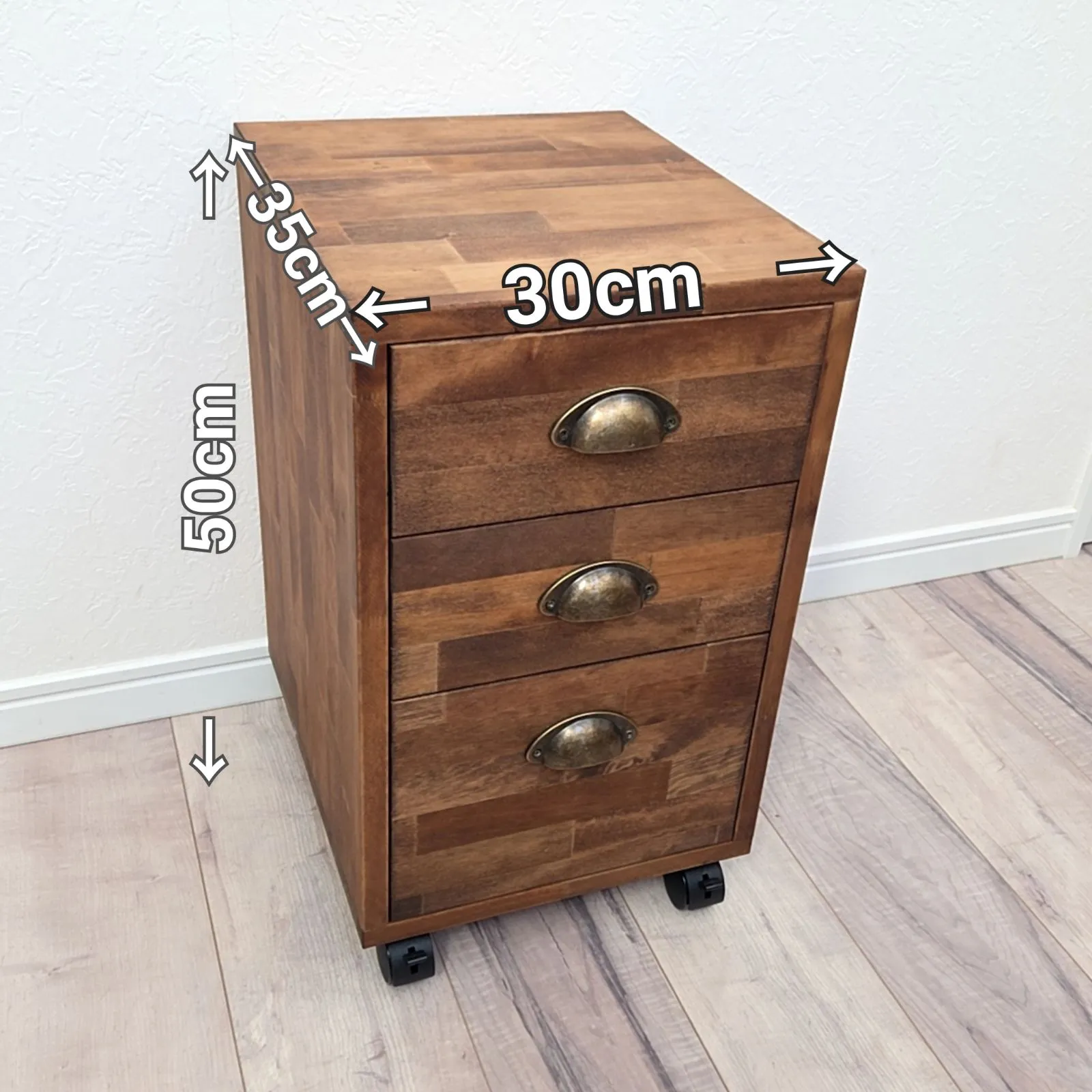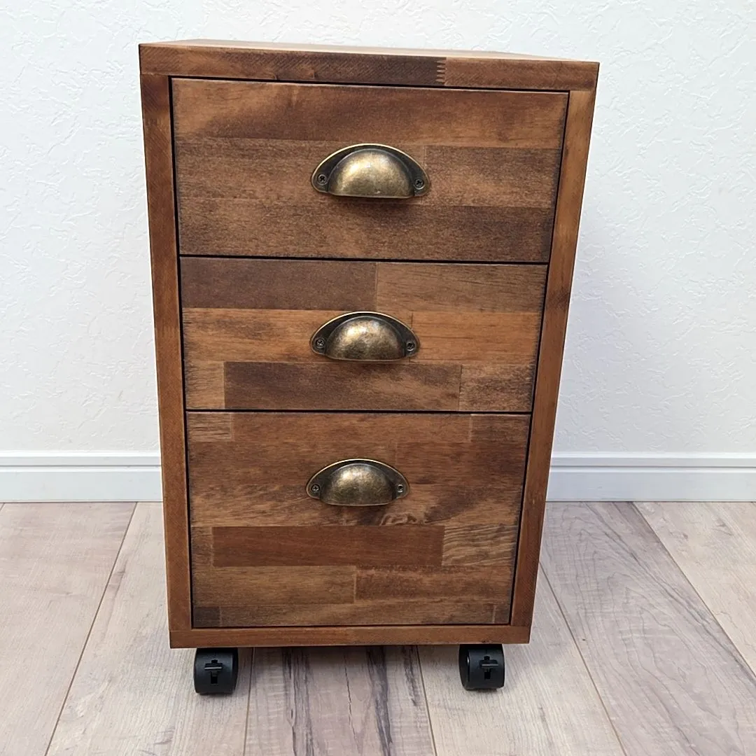 【サイズ】 全体:横幅30cm×奥行35cm×高さ50cm ※取っ手を除く 引出しの内寸(上段・中段):横幅20.5cm×奥行29cm×深さ10cm 引出しの内寸(下段):横幅20.8cm×奥行29cm×深さ15.5cm ※深さは物が入る高さのなり、引き出し横板は2-3cm程低くなります。 ご希望のサイズでのオーダーメイドも受け付けますのでメッセージにてご連絡ください。