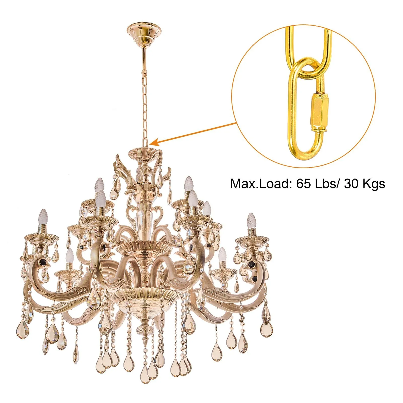当社のパッケージには、シャンデリアチェーン、調節可能なロックバックル2個、ネジロックバックル2個、照明器具に取り付けまたは接続するためのネジ2個が含まれています。(注意:購入前にチェーンの最大荷重と長さをご確認ください。登山プロジェクトには適していません。)