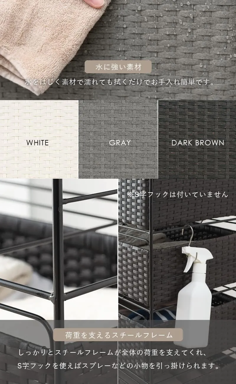 【使い道はいろいろ】:引き出しにはハンカチやタオル、衣類、サニタリーやランドリーグッズ、ストックなどが入ります。取り外してバスケットにもなるので、洗濯かごや脱衣かごとしても。お子様のおもちゃ入れやおもちゃ収納としてもおすすめ。 おしゃれなラタン調のランドリーチェスト。シンプルでスタイリッシュなデザインなのでインテリアに馴染みやすい。 引き出しにはハンカチやタオル、衣類、サニタリーやランドリーグッズ、ストックなどが入ります。取り外してバスケットにもなるので、洗濯かごや脱衣かごとしても。お子様のおもちゃ入れやおもちゃ収納としてもおすすめ。 水に強い素材なので安心して脱衣所、洗面所、ランドリールームなどに設置可能。コンパクトなのでリビング・ダイニング・玄関にも。 360度稼働するキャスターが付属しているので、移動や掃除の際も作業らくらく。ストッパー付きなので動かさない時は固定できます。 カラーはホワイト、グレー、ダークブラウンの3色。組み立ては脚の取り付けのみ!