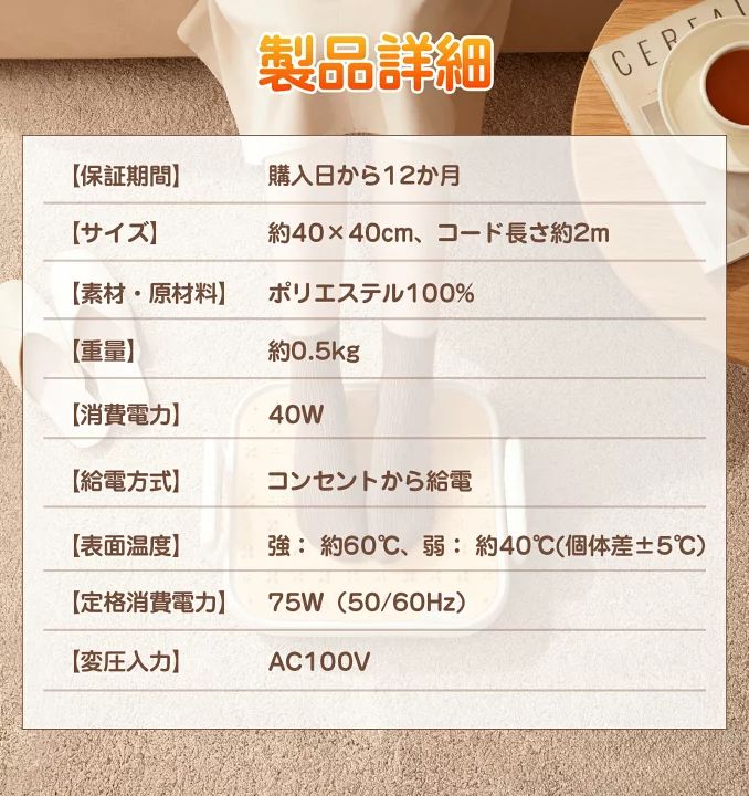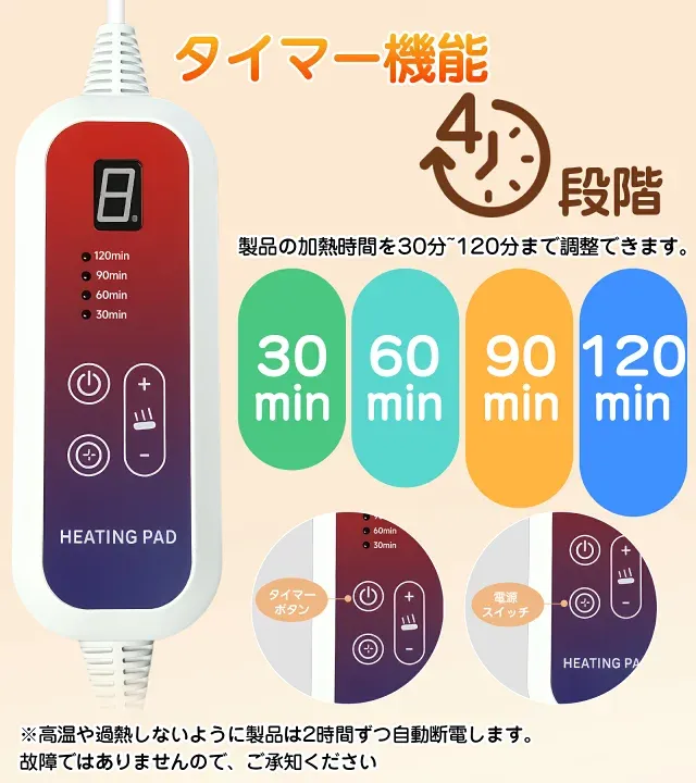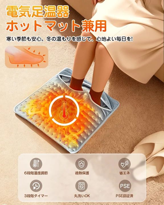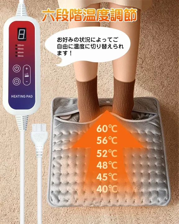 【6段階温度調節 & 4段階タイマー】 フットウォーマーは6段階の温度調整と4段階のタイマー機能を搭載し、 30秒以内に素早く加熱します。 電源を切り忘れても、設定した時間になると自動で電源が切れるので安心です。 起動時のデフォルト温度はレベル5、 タイマーは2時間です 足元を温めることで全身に温かさが行き渡り、寒い冬でも快適に過ごせます。 ★