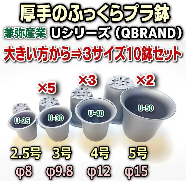 厚手のふっくらプラ鉢*カネヤ(兼弥産業)Uシリーズ(QBRAND)*大きい方から3サイズ:3号×5鉢*4号×3鉢*5号×2鉢の合計10鉢*多肉植物・塊根植物コーデックス・アガベ・サボテン・観葉・ハオルチア・アデニウム・パキポディウム・実生@フラワーショップ江口