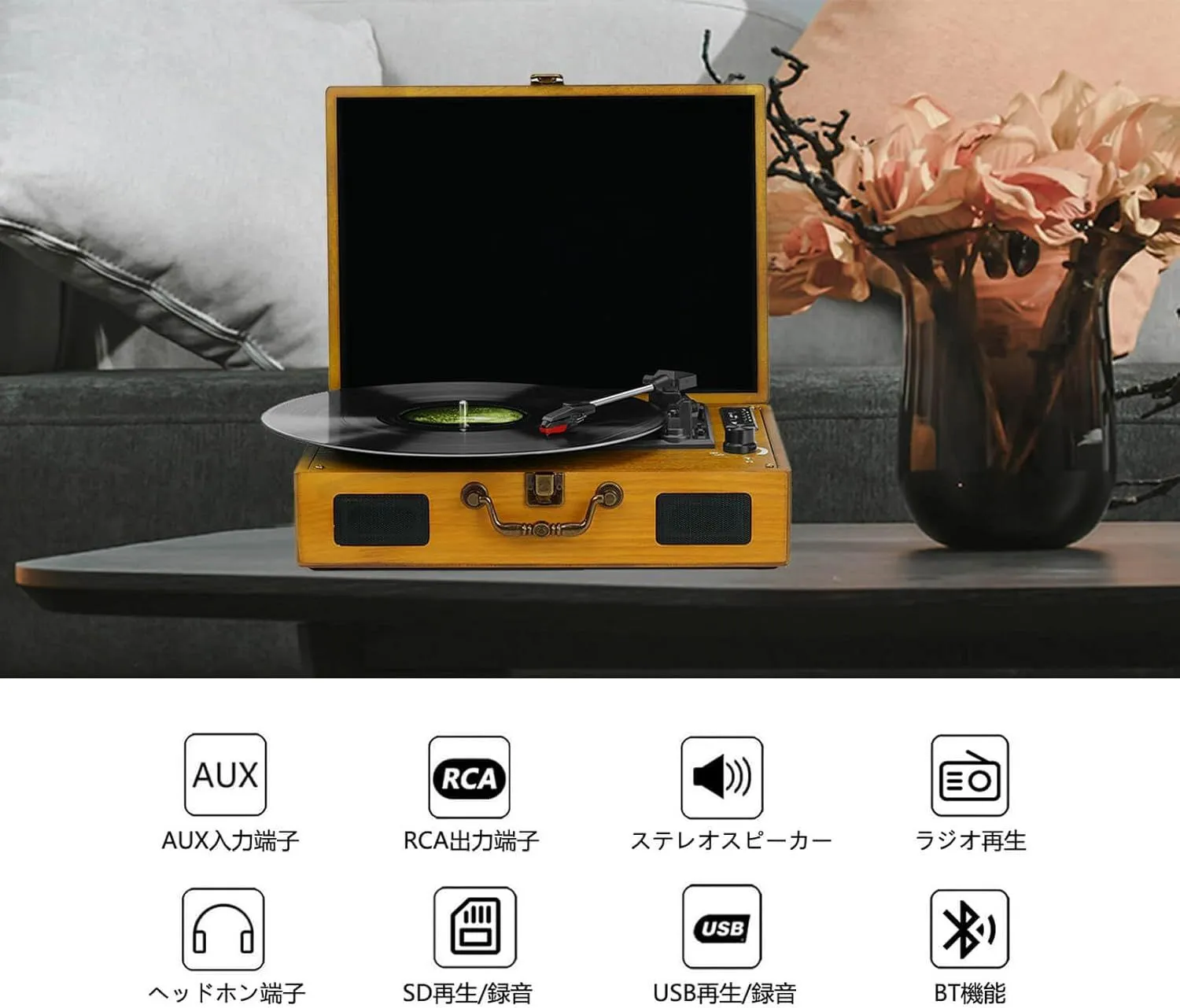 【Bluetooth対応|レコードもスマホ音楽もワイヤレスで楽しめる】 スマホの音楽をBluetoothでワイヤレス再生できるほか、レコードの音をBluetoothスピーカーやヘッドホンへ送信して、高音質のステレオサウンドを楽しめます。ラジオ機能も搭載しており、これ1台で多彩な音源に対応します。