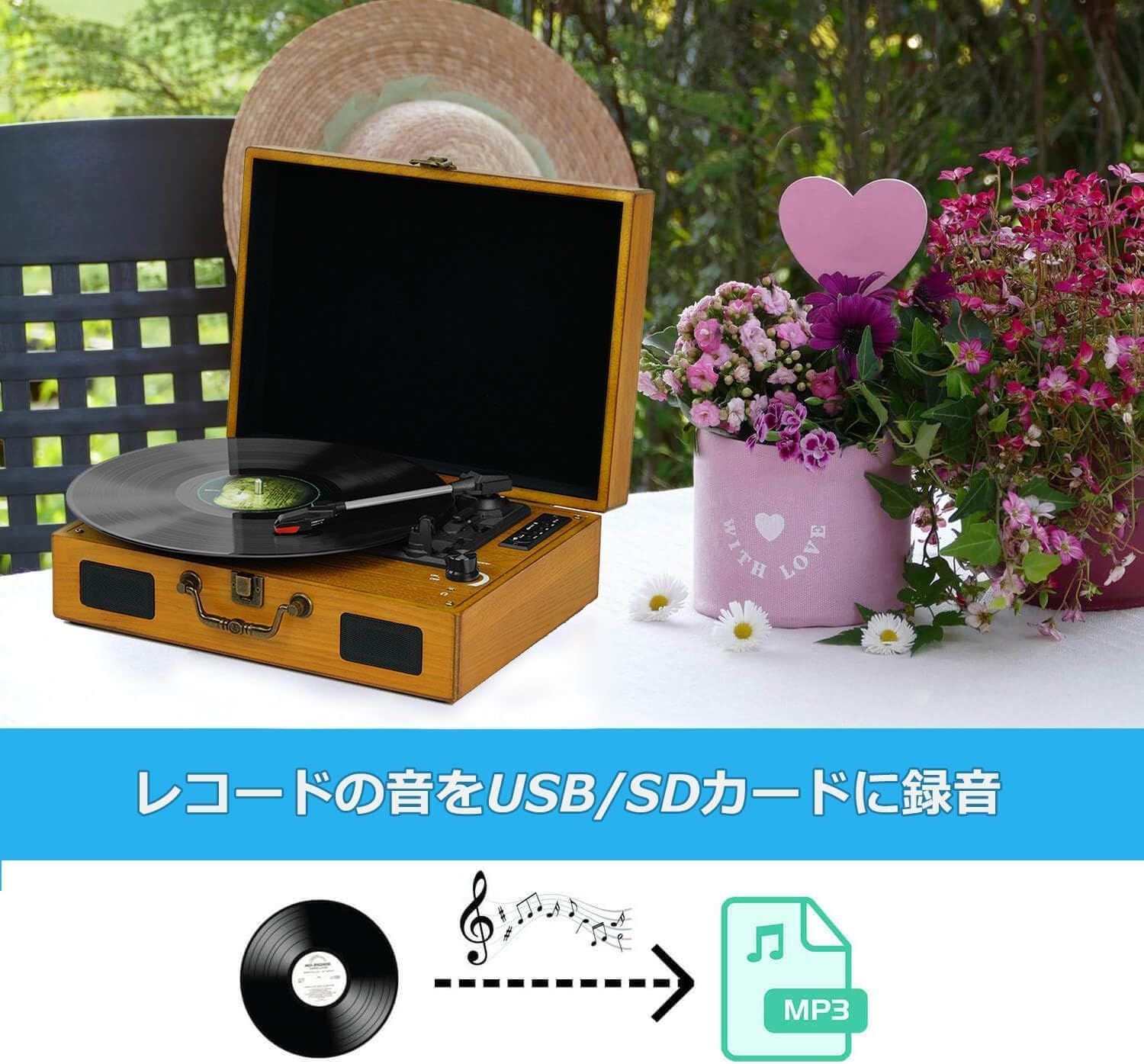 ポータブルレコードプレーヤー Bluetooth対応 USB/SD録音機能付き 33/45/78回転対応 ワイヤレス再生 AUX入力 FMラジオ内蔵 スピーカー付