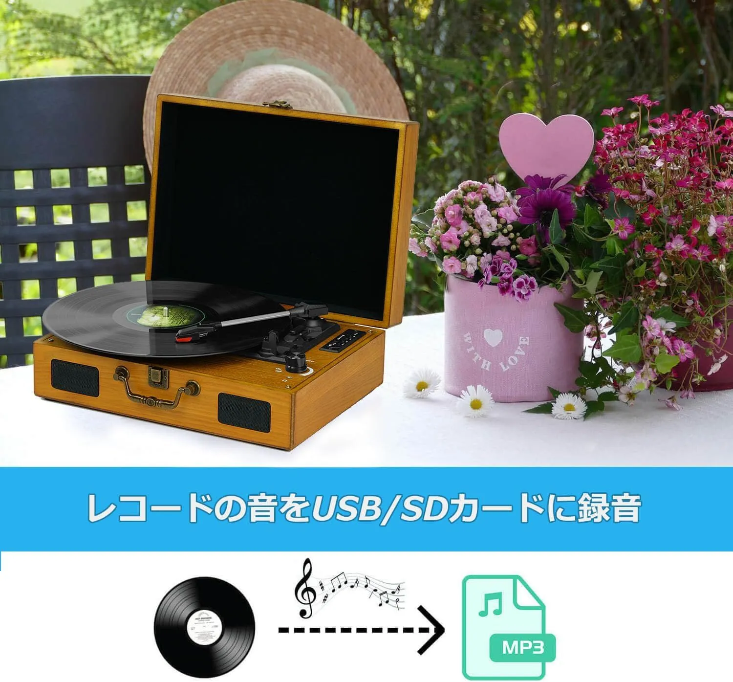 【アナログ音源をデジタル保存|PC不要でMP3録音】 レコードの音をUSBメモリーやSDカード(最大32GB)にMP3形式で簡単録音。パソコン不要で操作も簡単です。録音内容の確認や、お手持ちのMP3ファイルの再生も本体のみで可能。