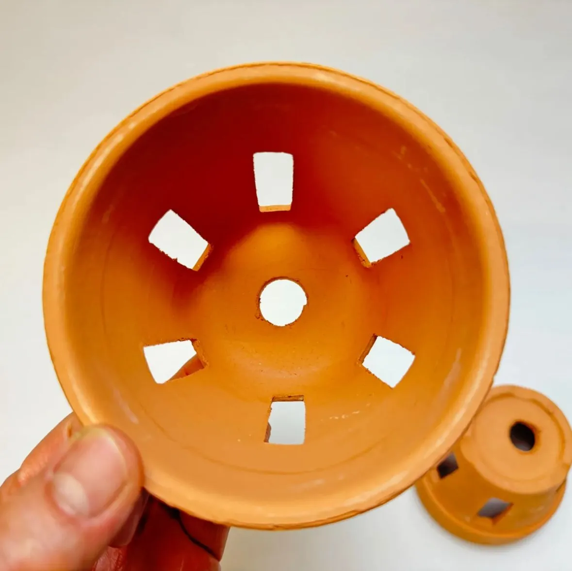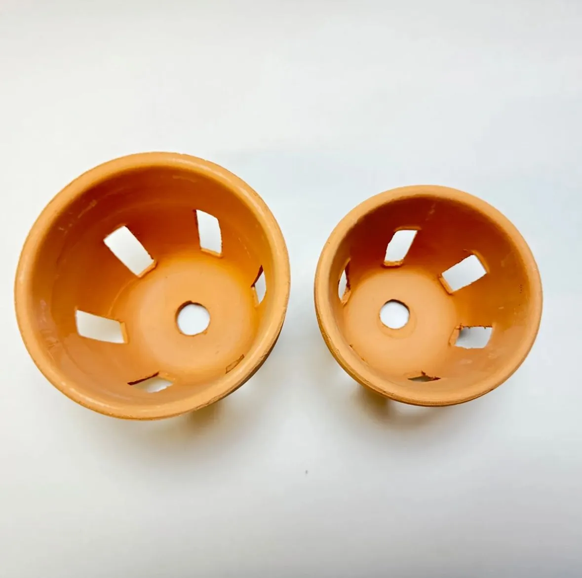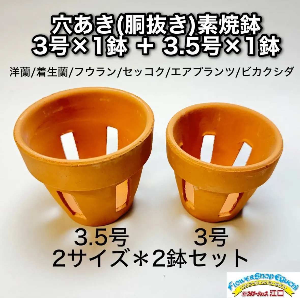 穴あき(胴抜き)素焼鉢- 2サイズ⇒2鉢セット: 3号×1鉢+3.5号×1鉢 [長四角形穴] 洋蘭/着生蘭/胡蝶蘭/カトレア/フウラン/セッコク/ エアプランツ/ビカクシダ(コウモリラン) ※利用に差し支えのない欠け凸凹はご容赦ください@フラワーショップ江口