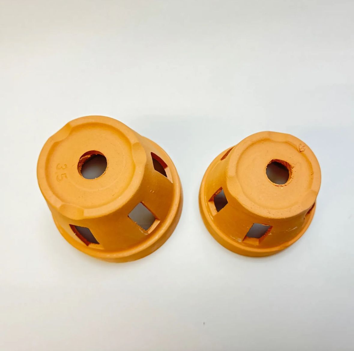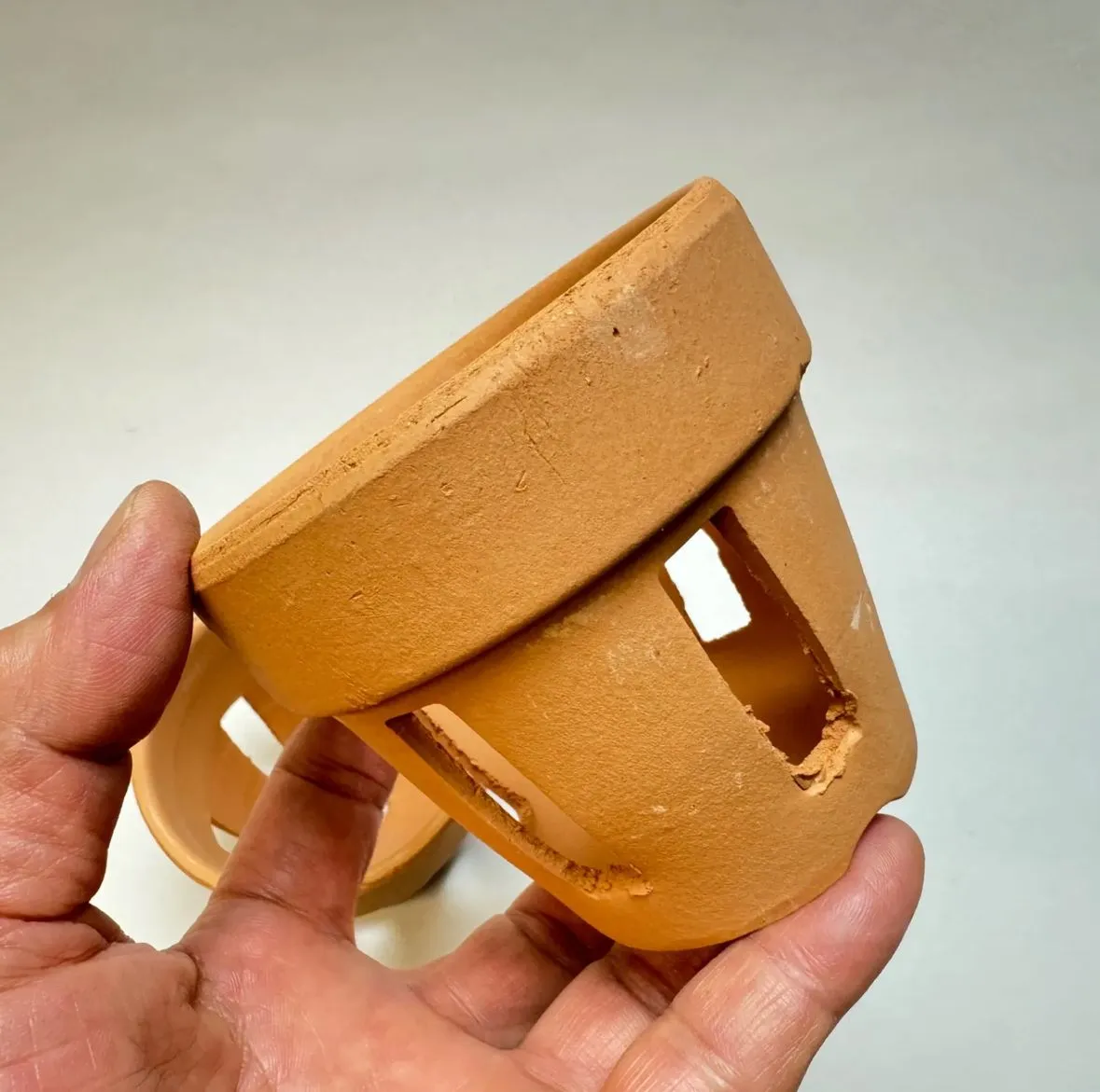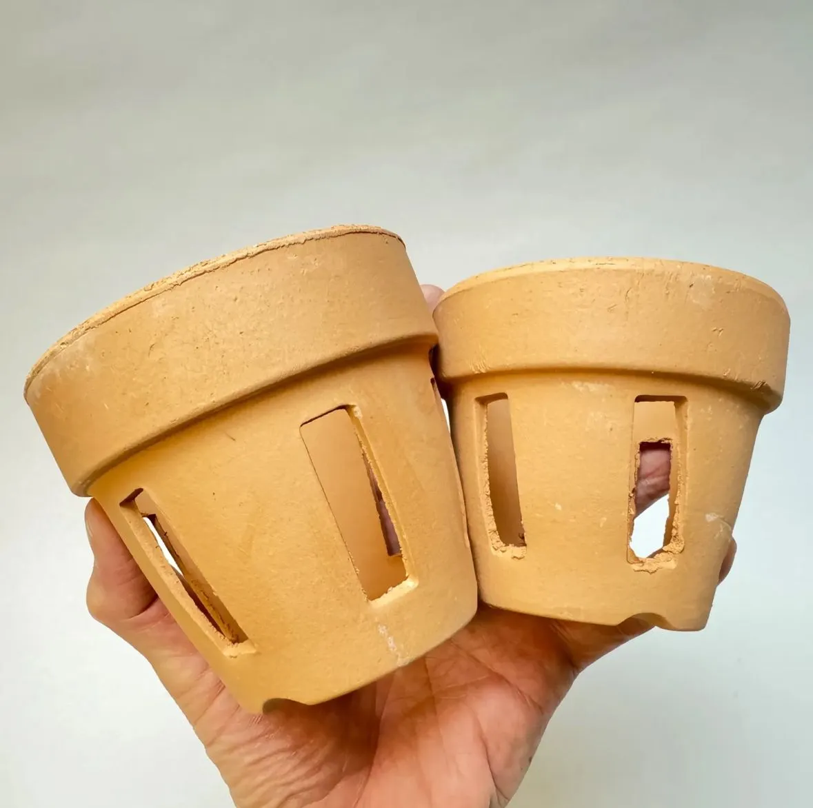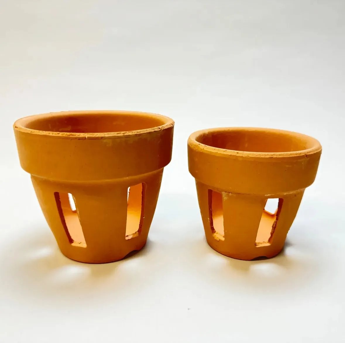 穴あき(胴抜き)素焼鉢- 2サイズ⇒2鉢セット: 3号×1鉢+3.5号×1鉢 [長四角形穴] 洋蘭/着生蘭/胡蝶蘭/カトレア/フウラン/セッコク/ エアプランツ/ビカクシダ(コウモリラン) ※利用に差し支えのない欠け凸凹はご容赦ください@フラワーショップ江口