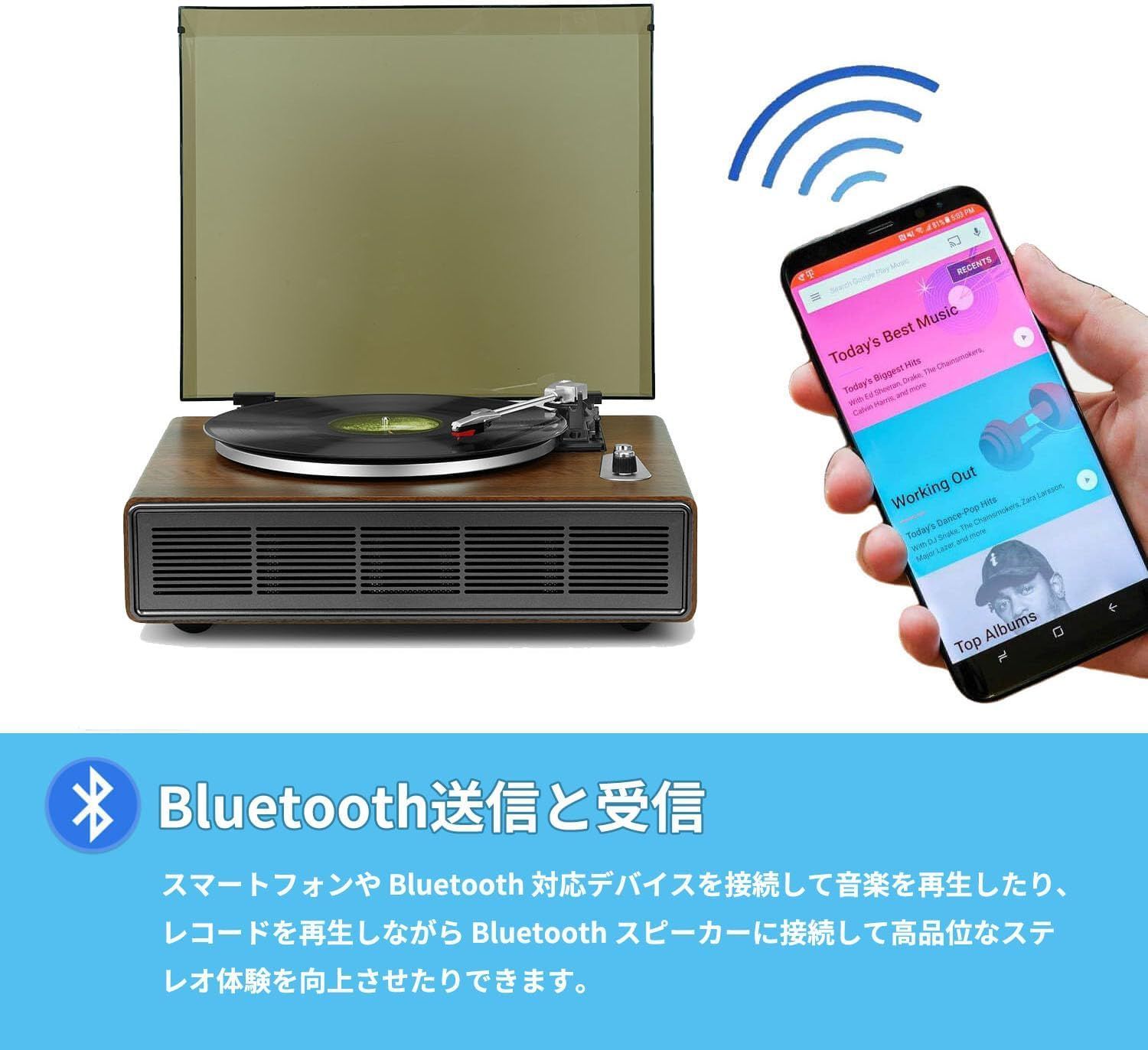 ◆Bluetooth送受信対応 ・スマホなどBluetooth対応機器からプレーヤーへ音楽をワイヤレス再生 ・レコードを再生しながらBluetoothスピーカーへ送信して、より迫力あるサウンドも楽しめます
