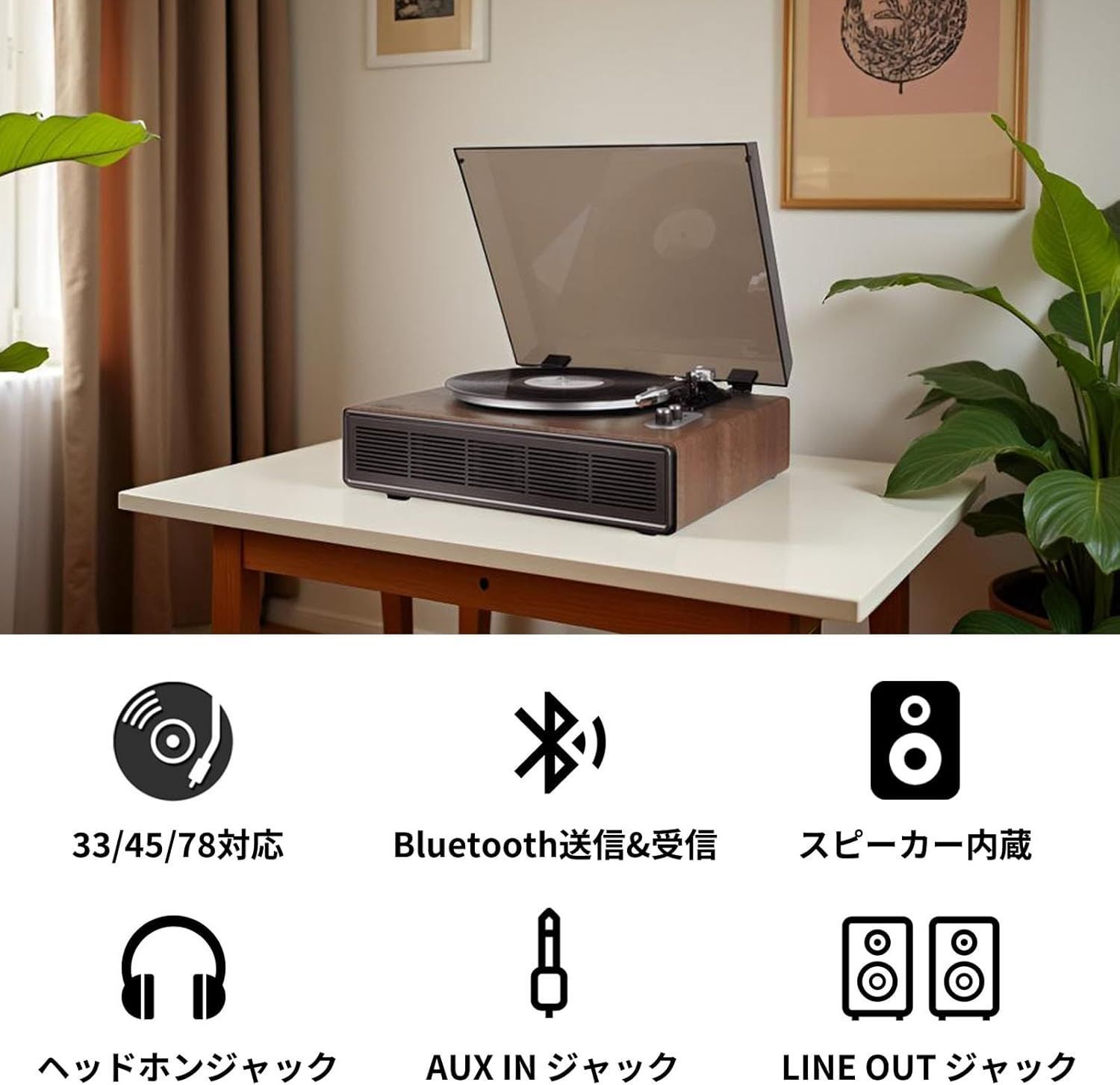 レコードプレーヤー Bluetooth スピーカー内蔵 ヘッドホン端子 AUX IN端子 スピーカー繋ぎ 33/45/78回転と7/10/12インチレコード対応