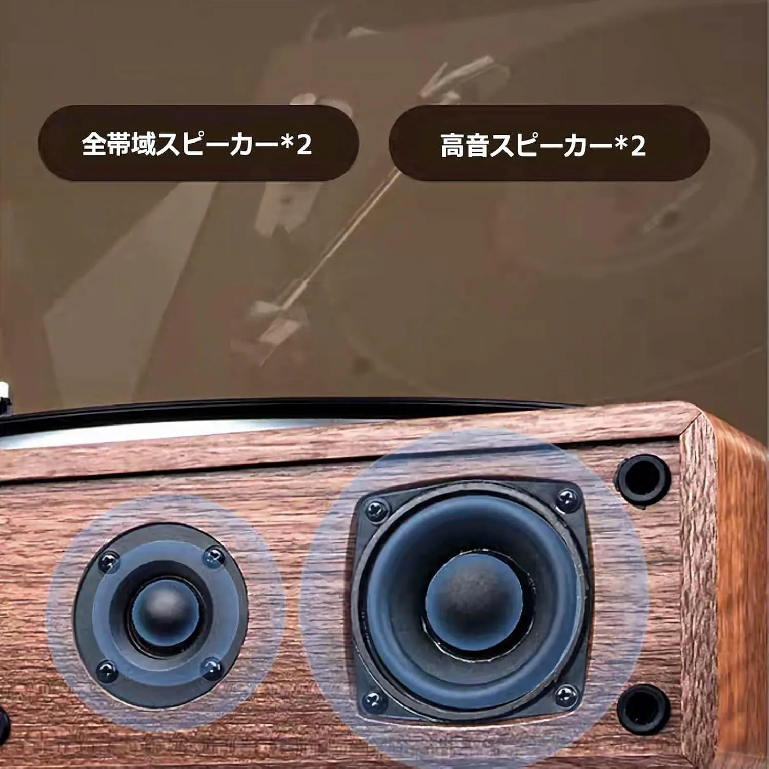 ◆ステレオスピーカー内蔵 全帯域スピーカー+高音スピーカーを内蔵しており、クリアな中高音からパワフルな低音までバランス良く再生できます。 外部スピーカーがなくてもレコードを楽しめる手軽さが魅力です。