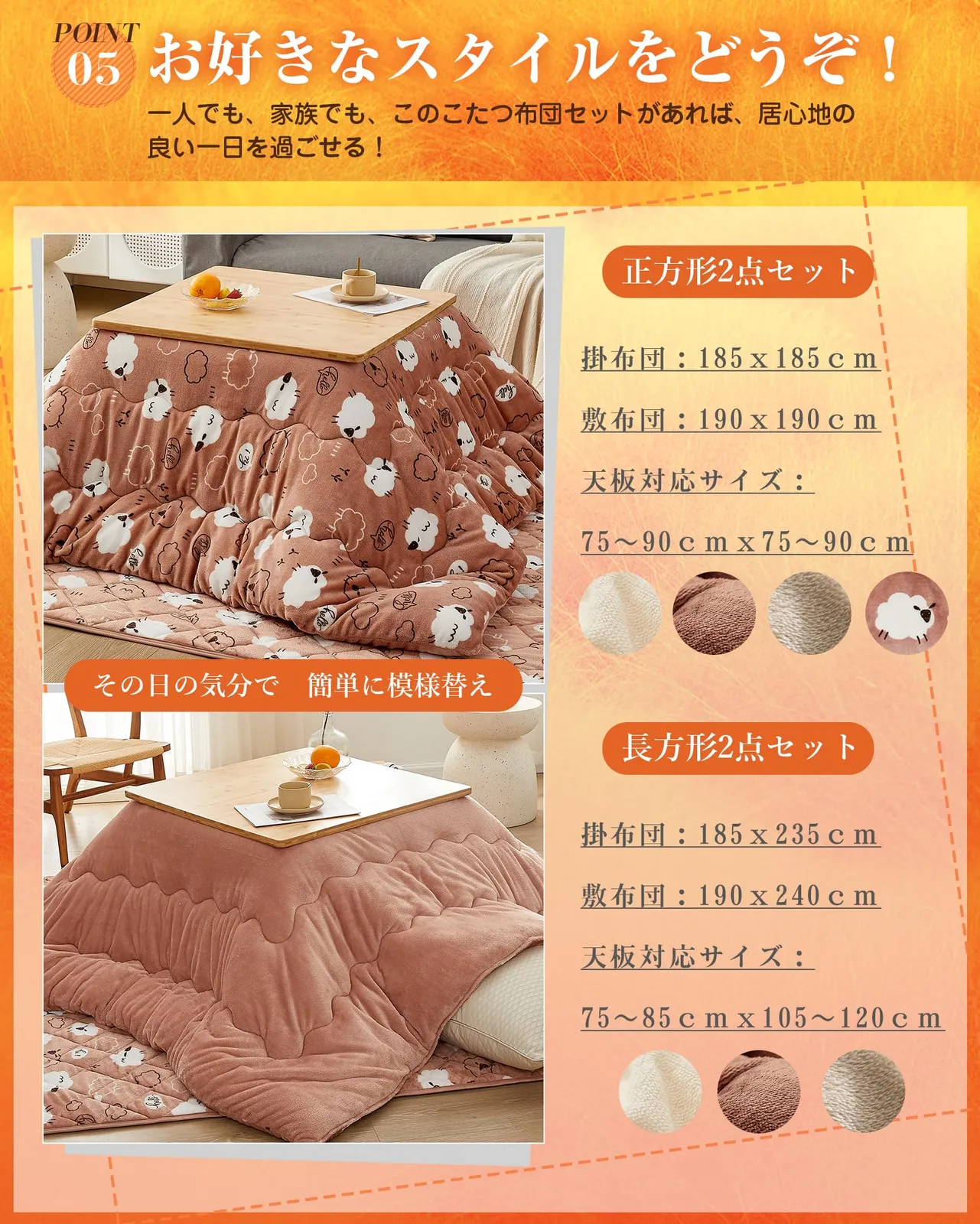 【サイズ】掛布団:約185×185cm;敷布団 約190×190cm (対応こたつサイズ:幅75?90×奥行75?90cm)※本品はこたつ布団とこたつ敷布団のセットで、テーブルは含まれておりません。