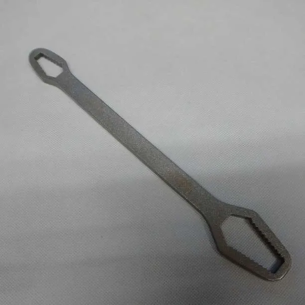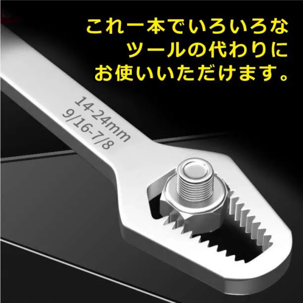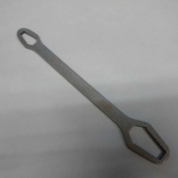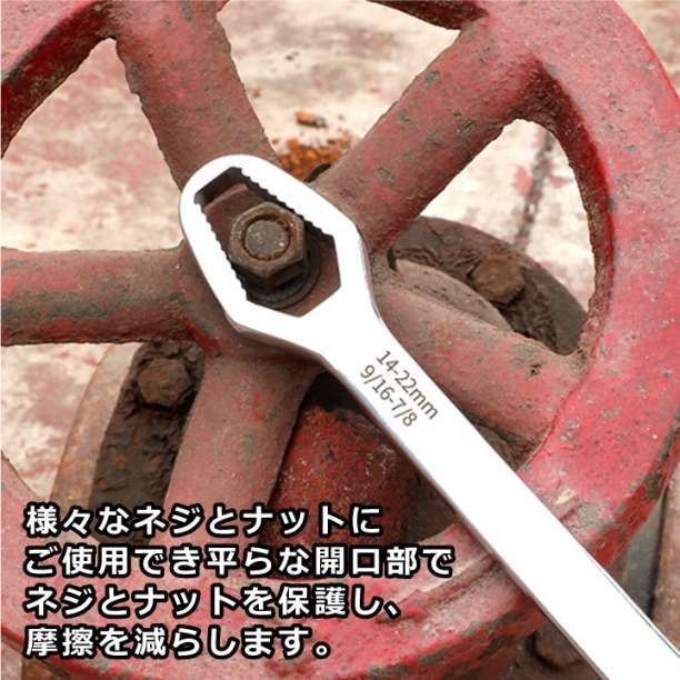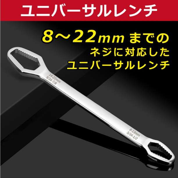 シルバーのユニバーサルレンチになります。8〜22cmのネジに対応しています。有効サイズは8〜13cm、13〜22cmです。