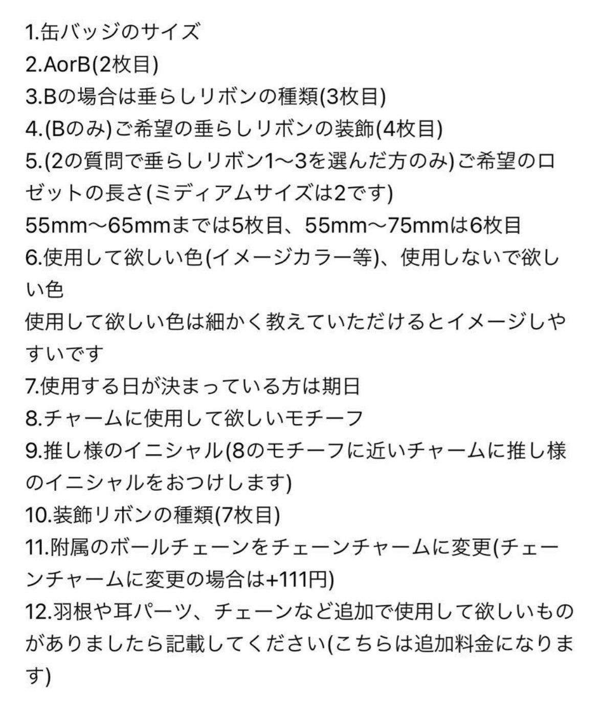 12.羽根や耳パーツ、チェーンなど追加で使用して欲しいものがありましたら記載してください(こちらは追加料金になります)