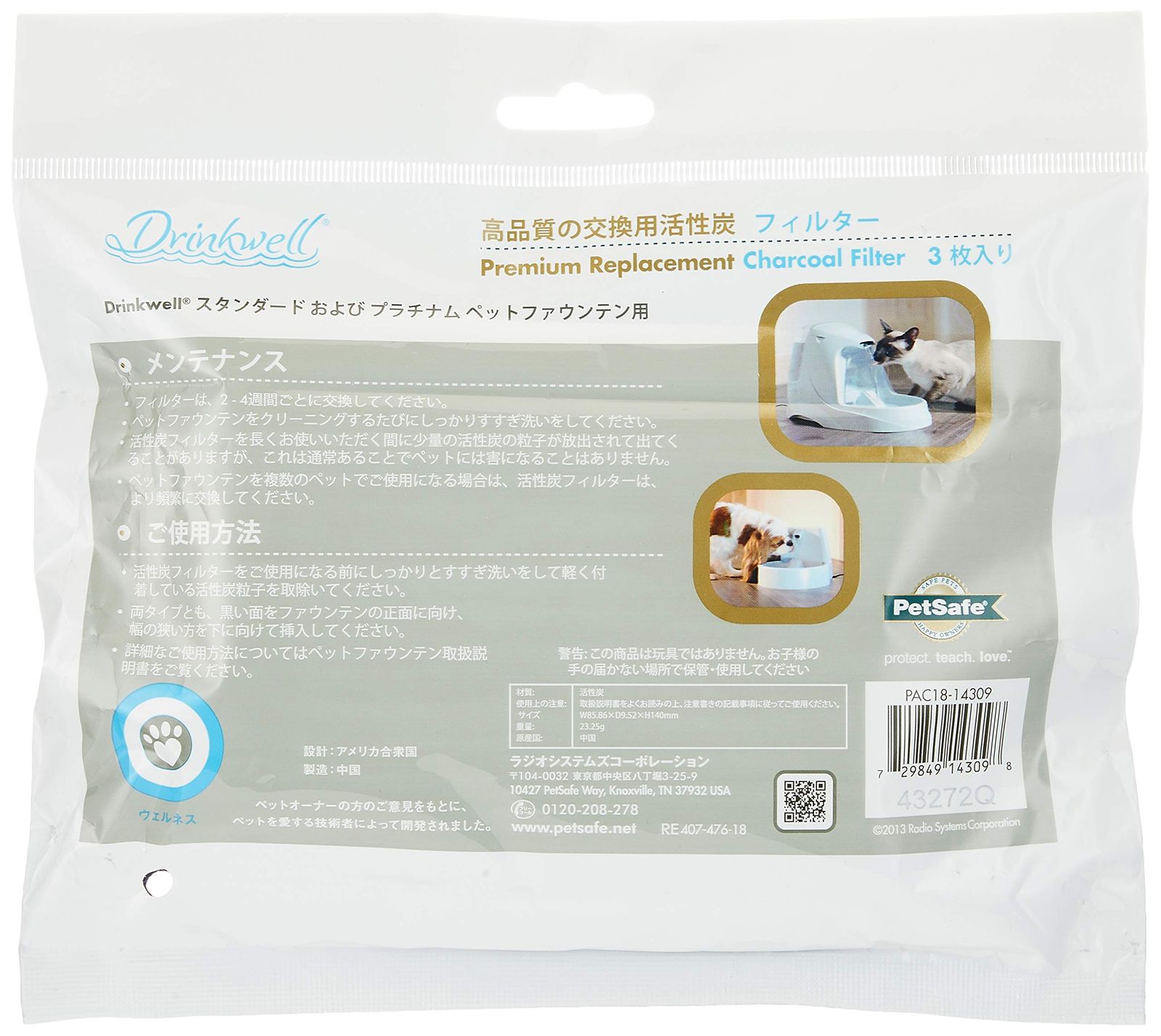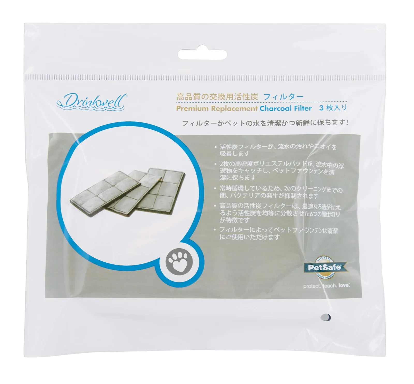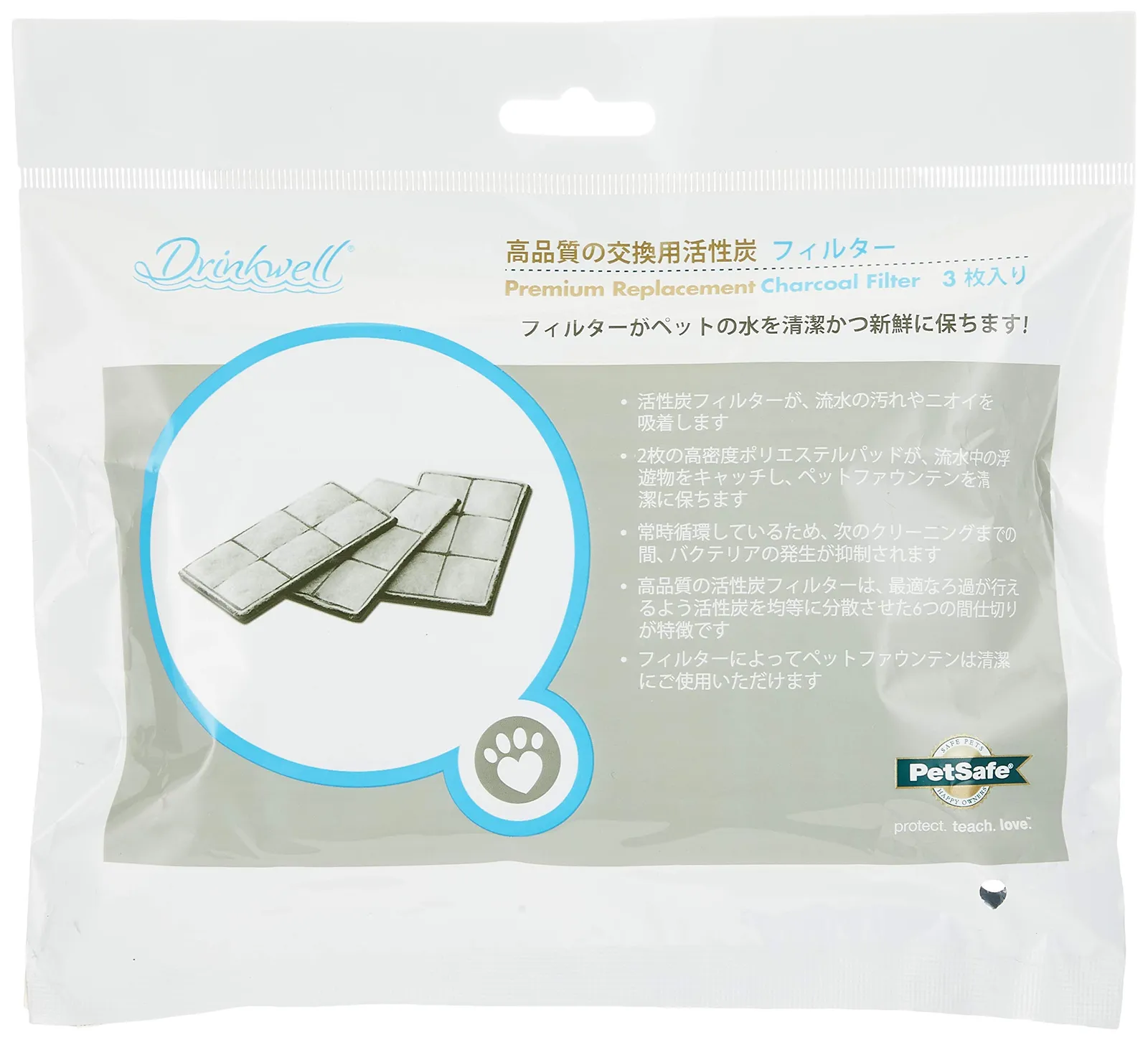 ペットセーフの給水機「ドリンクウェル」スタンダードおよびプラチナム専用の交換用活性炭フィルター (3枚入り)です。水の独特なニオイを取り除き、いつでも飲みやすく、おいしい水をペットたちに提供します。 使用上の注意 活性炭の粒が給水器の水中に入ったとしてもペットに害はありません。 原材料・成分