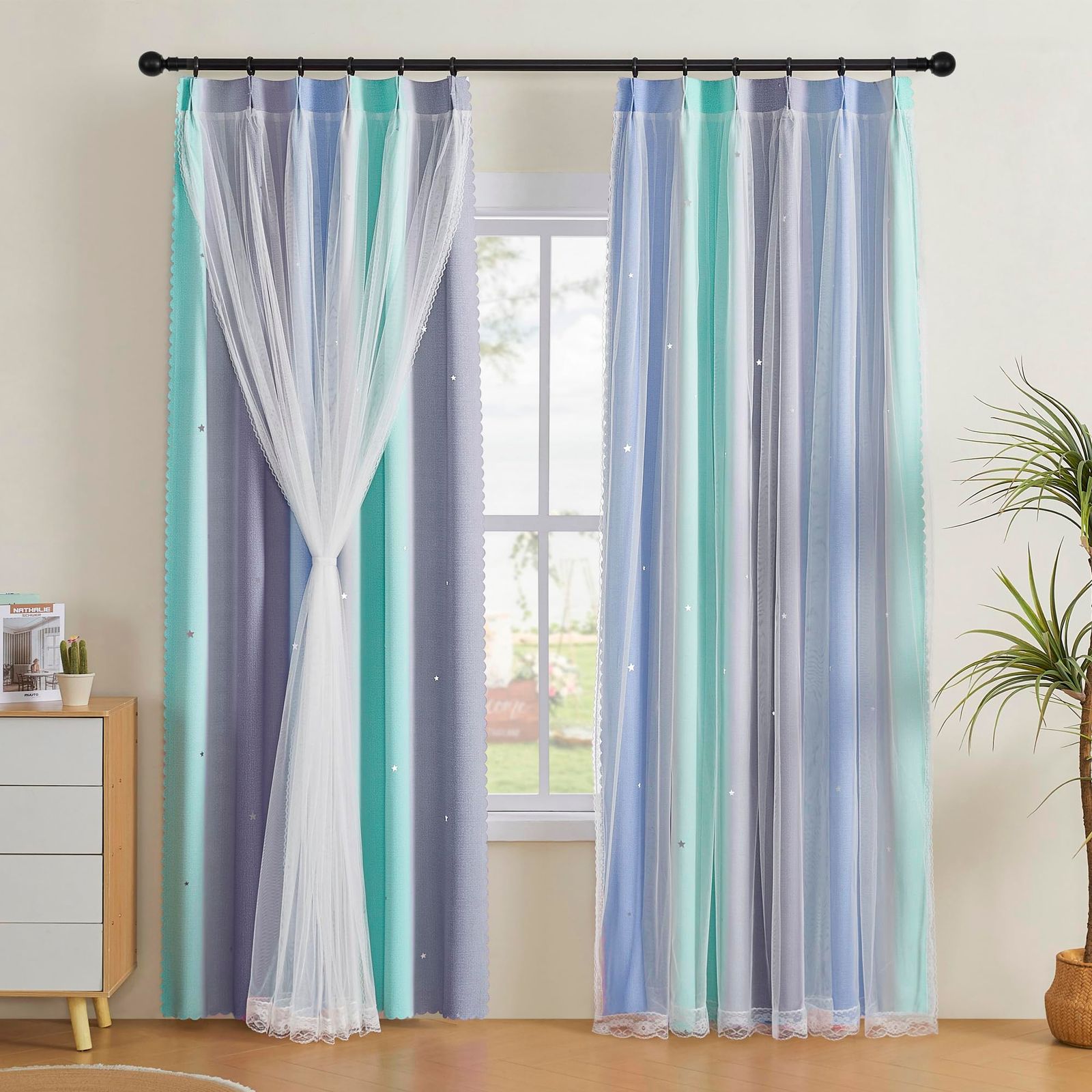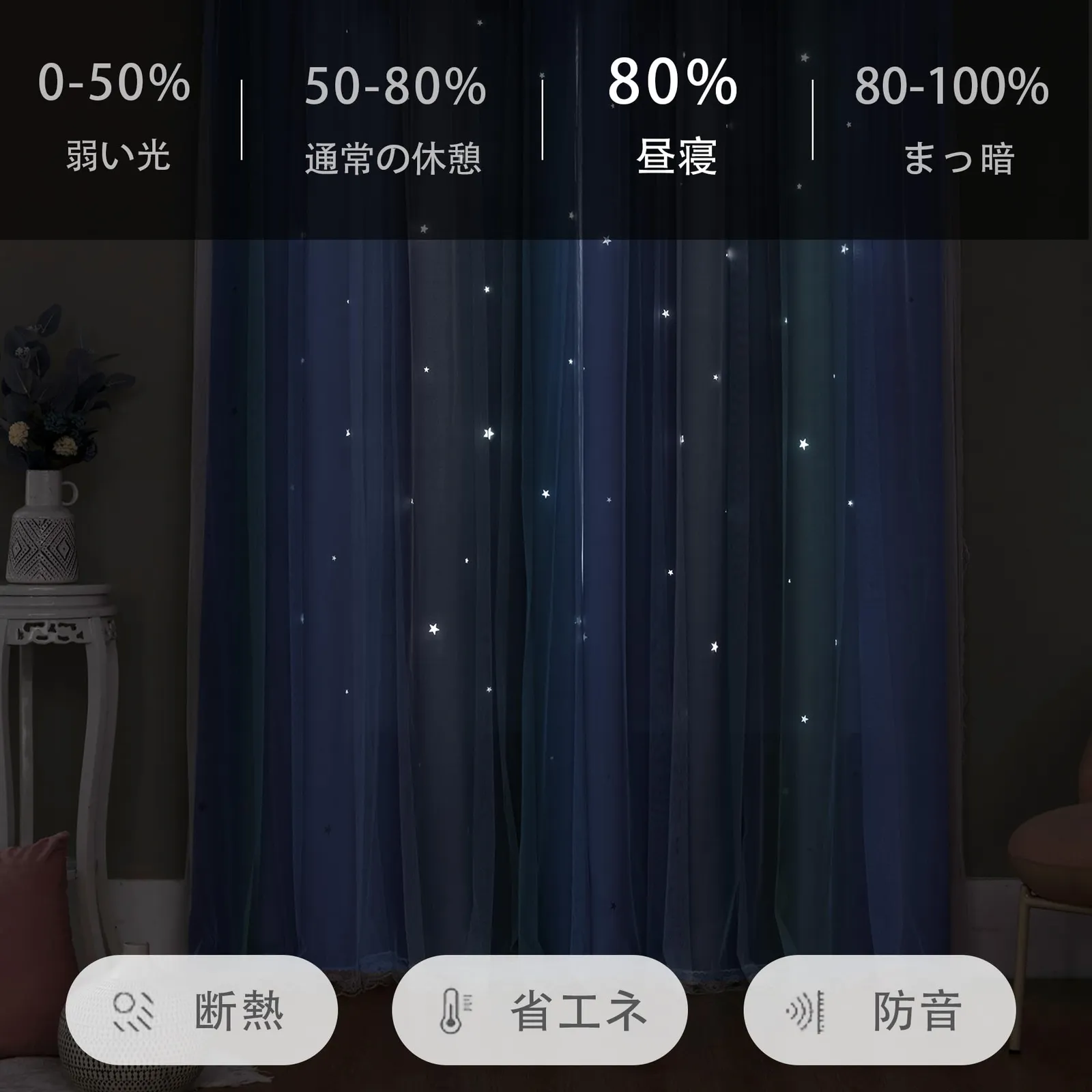 高品質の素材: 透かしのカーテンのレイヤーは、高品質のガーメントメッシュファブリックで作られ、底とサイドエッジには高品質のレースが施されています。遮光カーテンのレイヤーは、特殊な三層の編み込みプロセスを持つポリエステルファブリクです。高品質のポリエステルファブリックのみが良い色を印刷でき、手触りも良く、切り抜かれた星がより完全で、カーテンのドレープが良くなり、80%の遮光効果があります。