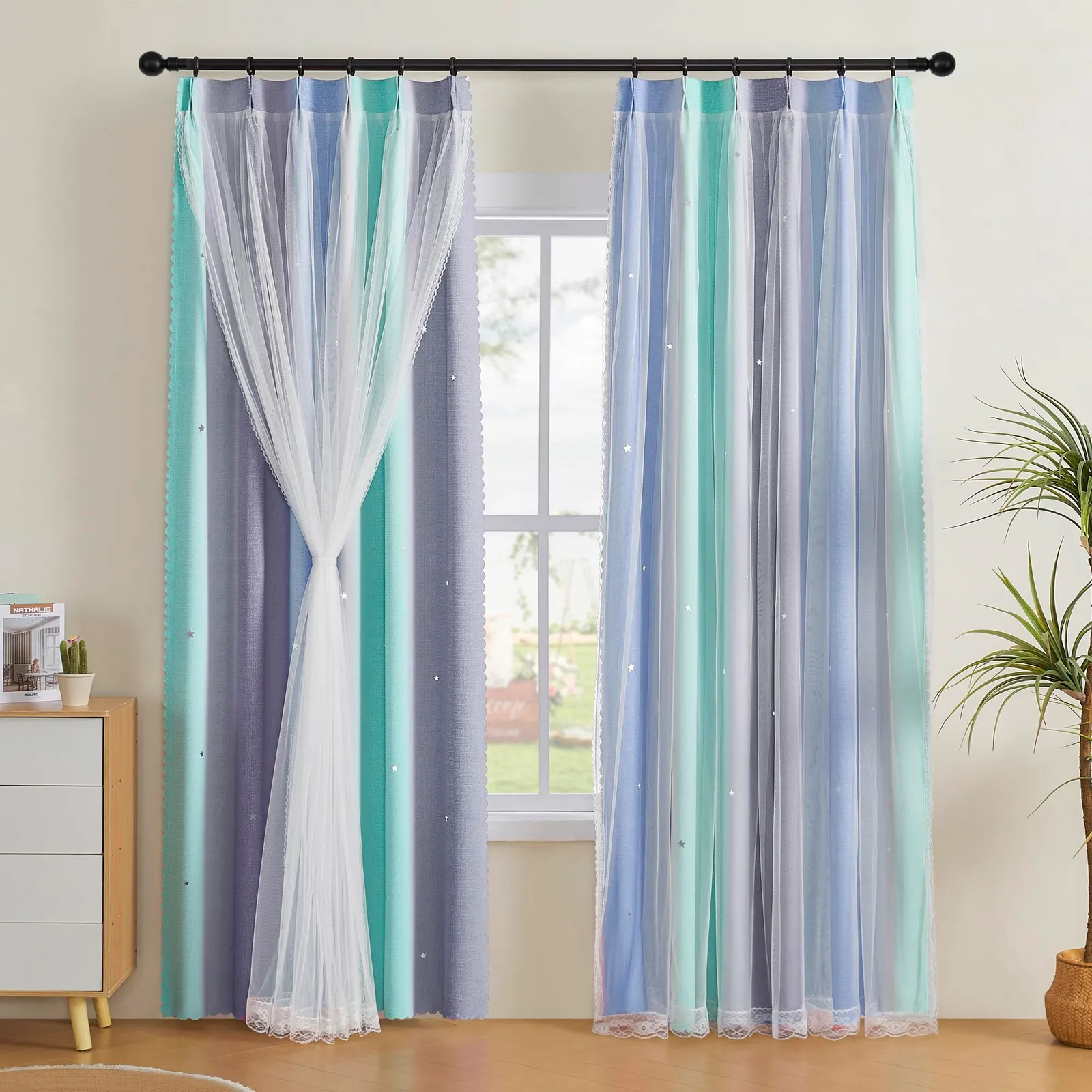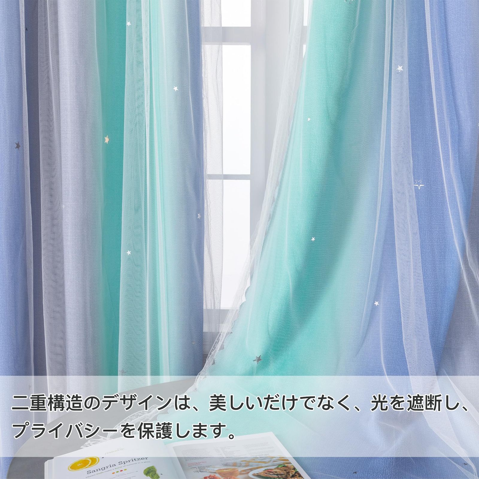 独特なデザイン:カーテンは二重構造の二合一デザインになっており、そのうちの一?は薄くて透明感のあるガーゼを使用しています。ガーゼの軽やかさと透明感は、ロマンチックでぼんやりとした雰囲気を作り出します。遮光カーテンにはレーザーでくりぬかれた星々があり、光が透過するとまるで瞬いている星のように、部屋に夢のような空間を作り出します。遮光カーテンはまた、デジタルプリント技術を使用して三つの色のグラデーションを実現しており、色彩が調和し、装飾効果を強化しています。