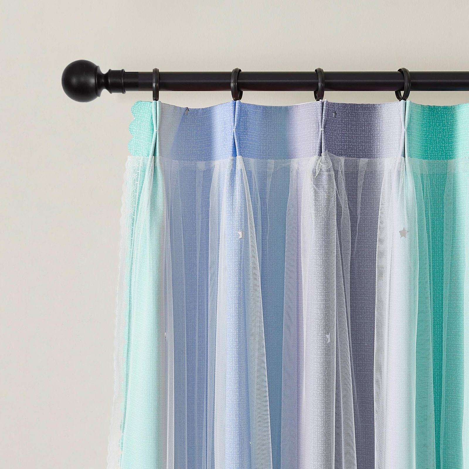 パッケージには、2枚のカーテンパネルと2本のタイが含まれており、各パネルにはシースルーのカーテン1枚とプリントされたブラックアウトカーテン1枚がついており、レーザーカットアウトの星模様が施されています。