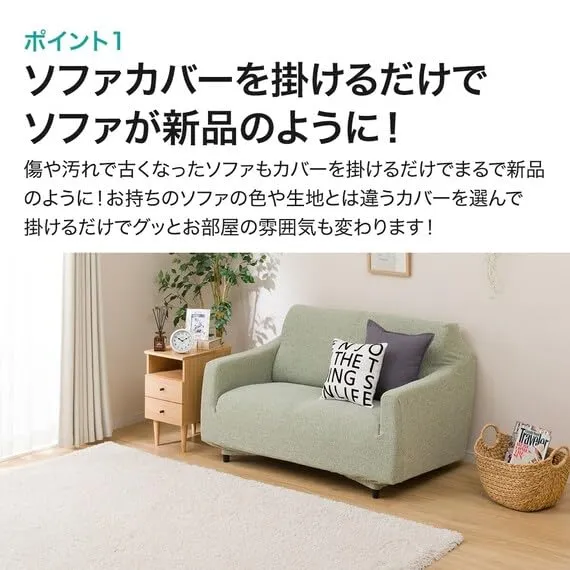傷や汚れで古くなったソファもカバーを掛けるだけでまるで新品のように お持ちのソファの色や生地とは違うカバーを選んで掛けるだけでグッとお部屋の雰囲気も変わります