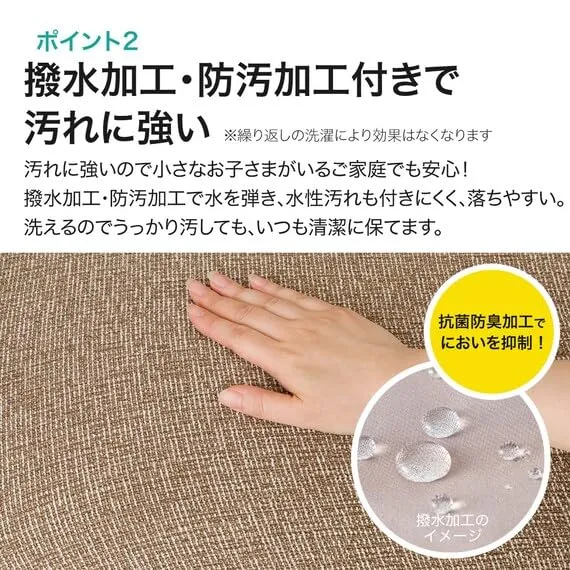 汚れに強いので小さなお子さまがいるご家庭でも安心 撥水加工・防汚加工で水を弾き、水性汚れも付きにくく、落ちやすい。洗えるのでうっかり汚しても、いつも清潔に保てます。
