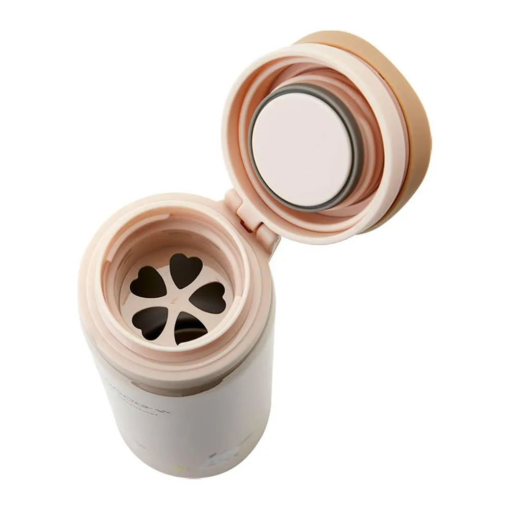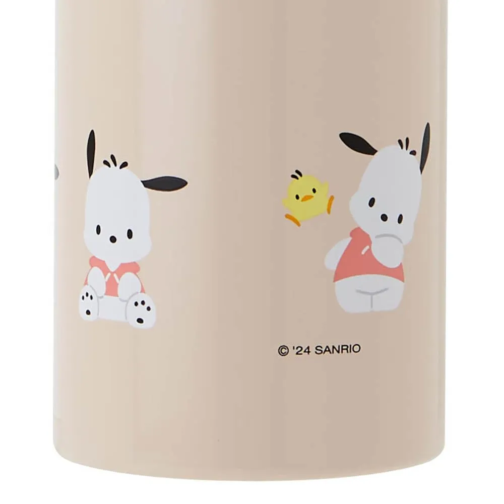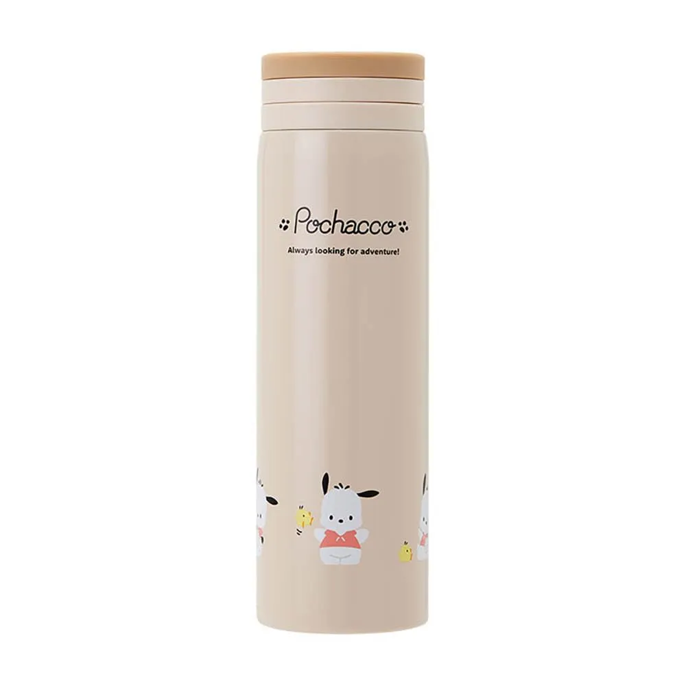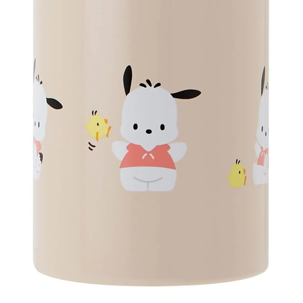 持ち歩きにお役立ちなステンレスボトル。いろんな表情のポチャッコがボトルを彩る。冷たい飲み物も温かい飲み物も楽しめるステンレス真空2重構造。
