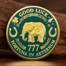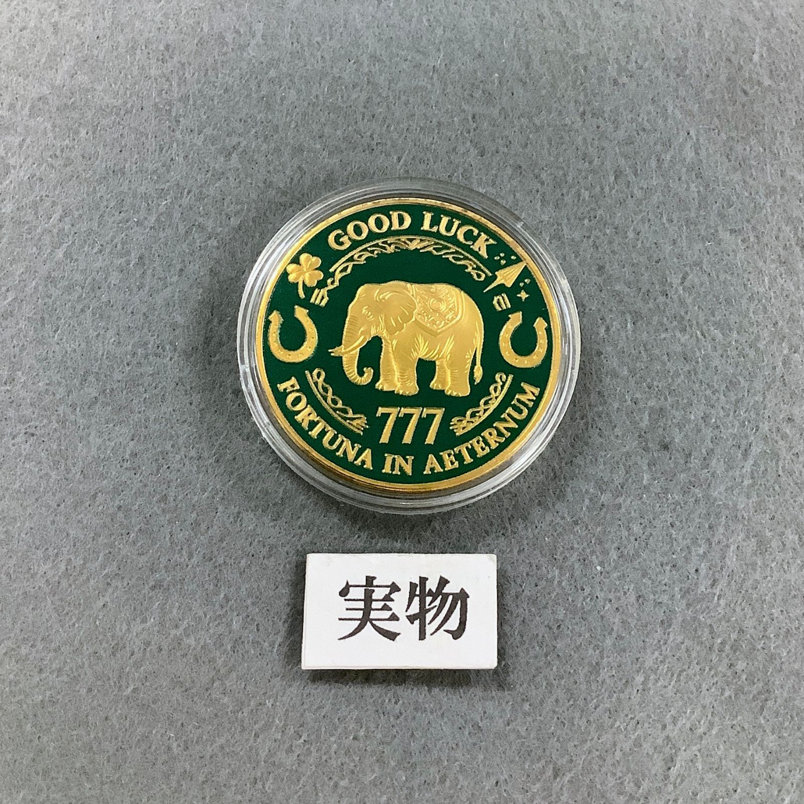 表面には力強く歩む象の姿と「GOOD LUCK(幸運を)」の文字、そして幸運数字として知られる「777」。