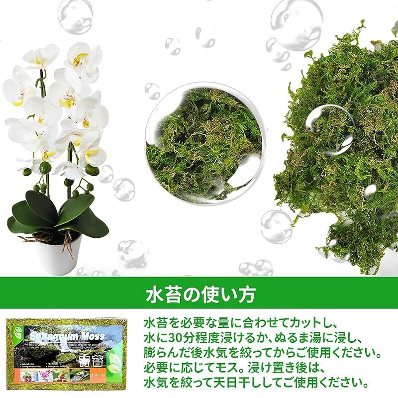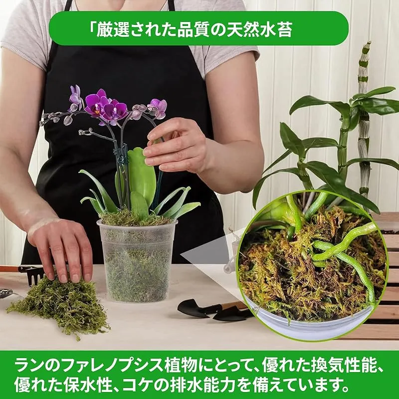 【優れた保水・排水性】水苔 は抜群の通気性と保水性を兼ね備えており、根腐れを防ぎながら植物の健康な成長を促進します。水苔は胡蝶蘭などのラン科植物に最適な栽培環境を提供します。 ??