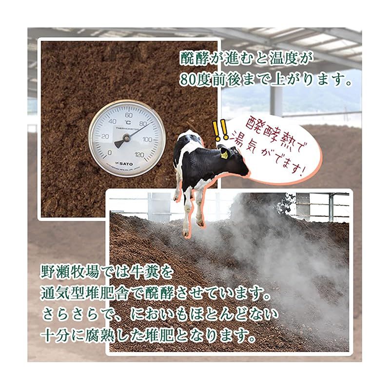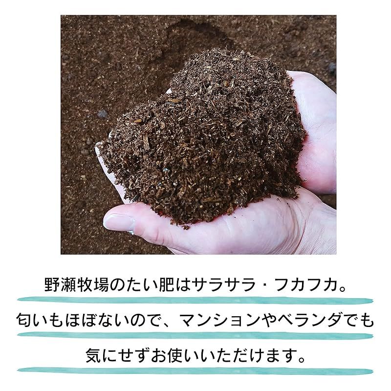 【商品説明】 牛糞醗酵堆肥とは牛の糞を発酵させた有機肥料です。 少量の使い切りサイズは置き場所に困りません。 小さなプランターや、ガーデニングにも使いやすいです! 作物や花を育てるための土壌を作るために使用され、 土壌を改良することで、野菜や果物を美味しく、植物をきれいに栽培することができます。 排水性、通気性を良くし保水力を高めるので水や空気が通りやすくなり ふかふかの土へと改良していきます。 野瀬牧場では牛糞におがくずを混ぜ、発酵させています。 ほとんど匂いもなく、さらさらしているので使いやすい堆肥です。 造園業や果物農家・野菜農家の方から好評でリピートされています。 匂いがほぼないので、家庭菜園やベランダでのプランターでのご使用もおすすめです! 薔薇などの植物にご使用されるかたもおられます。 成分表をご覧になり、育成されている作物や植物に合わせてご利用ください。 入れすぎますと成分過多となりますのでご注意ください。