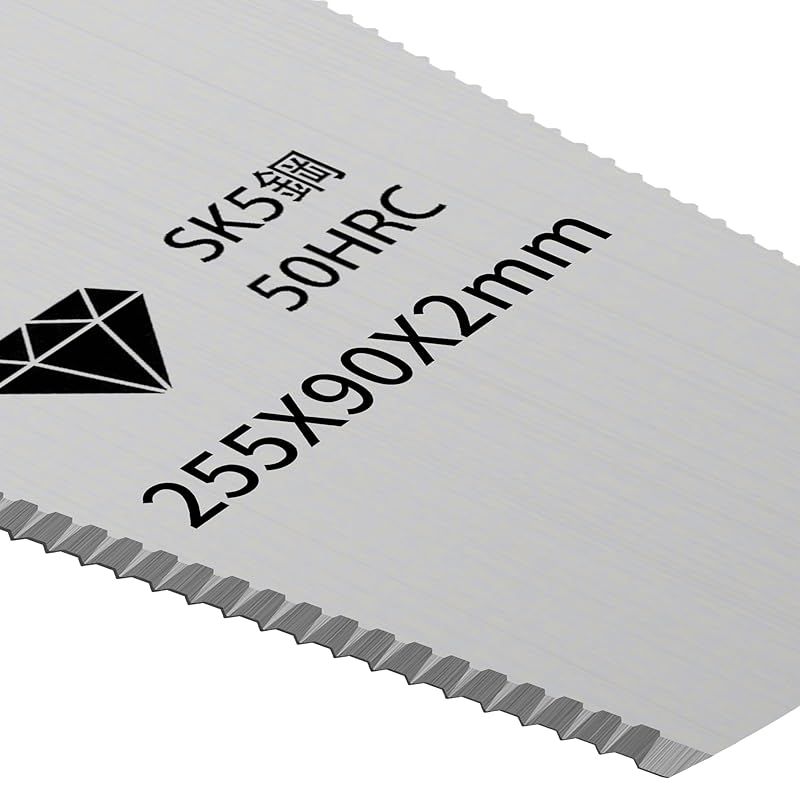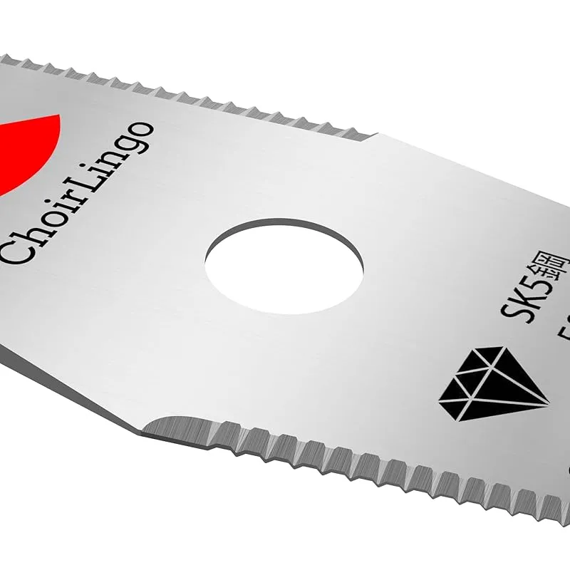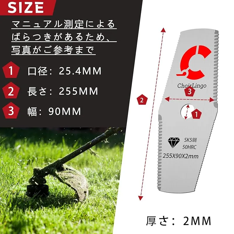 【高硬度SK5鋼製シュレッダーブレード(草刈り機 替え刃)】 当社の草刈り刃 は、硬度50HRCのSK5工具鋼を採用。石や硬い茎にも強く、長時間の使用でも耐摩耗性を発揮。プロ仕様の 刈払い機 刃 としても安心の品質です。