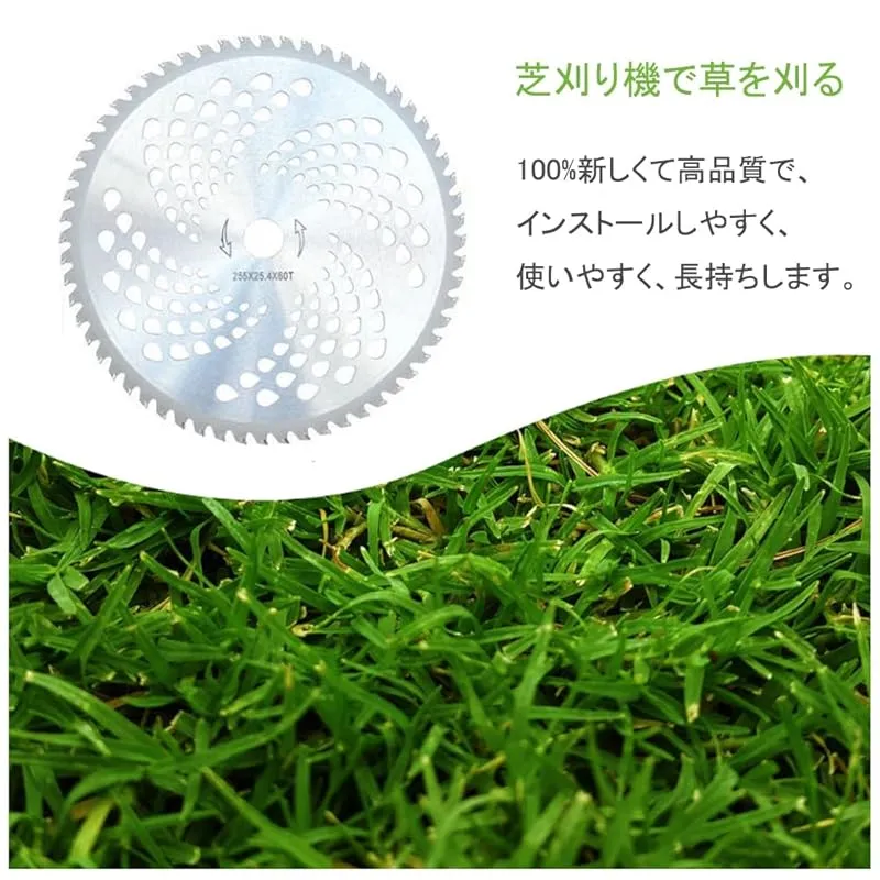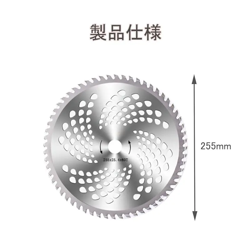 【サイズ】外径約255mm×内径約25.4mm×刃厚約1.5mm、刃数:40P/60P/80P 。ご購入前に草刈機のサイズをご確認ください。
