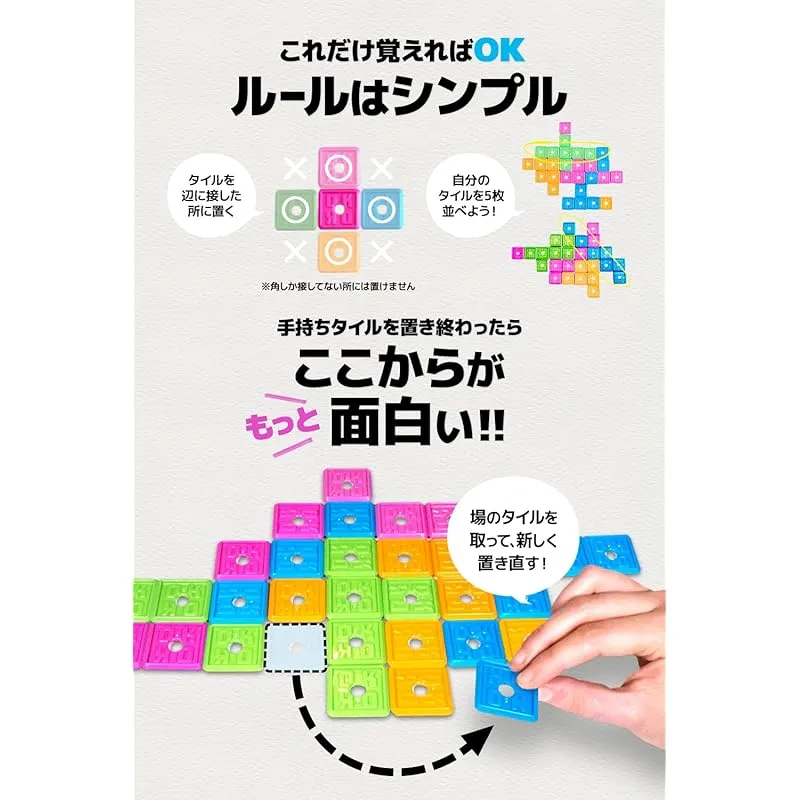 【 10秒でわかる!かんたんルール 】 タテ、ヨコ、ナナメのいずれかで5つのタイルを最初に並べたら勝利! 6歳~小学生から大人の方まで一緒に楽します。かんたんルールで戦略性が楽しめて、ボードゲーム初心者の方や子どもでもゲームに勝つことができます! ?